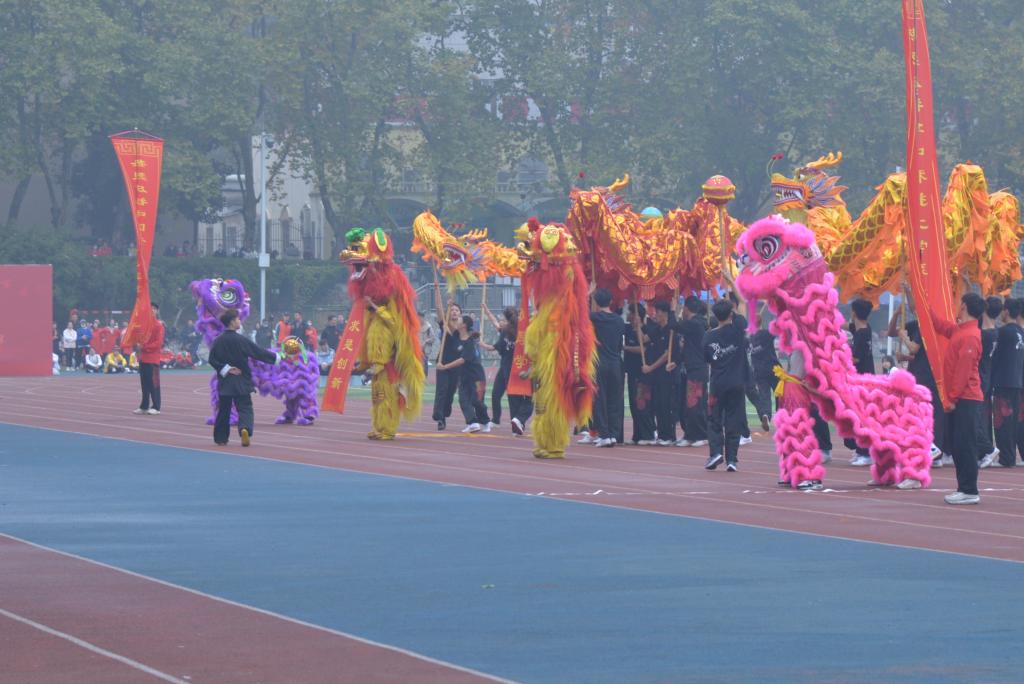 随后,舞狮舞龙队出场,增添欢乐氛围。舞动的龙狮时而奔腾跳跃,时而直立乱舞。队员们早上六点就来到了学校,在经过短暂的排练之后飞向场上。狮舞在山,龙腾于峡,可其志犹天!