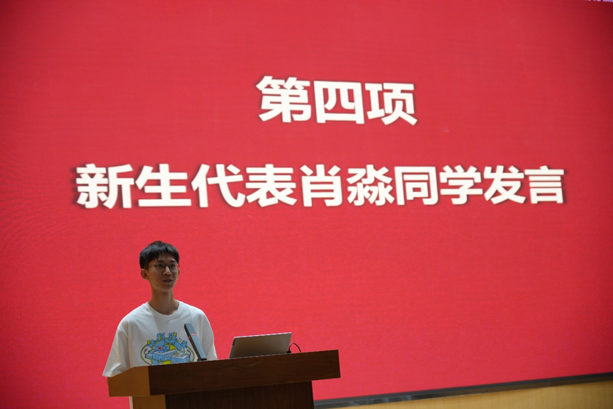 电子信息类2207班肖淼作为本科新生代表讲话。芯片危机让他与华中大光电信息学院结缘,也让他认识到了身为新一代光电人的机遇与使命。作为新一辈追光者,他呼吁大家“应当秉持进取之心,胸怀家国之情,探寻光电奥秘,以科技之力报效祖国”。