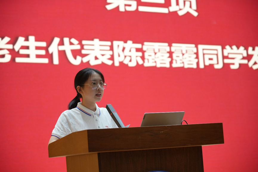 求学之路除了老师的谆谆教诲,还有学长学姐的亲切关怀。学院2019级本科生、院学生会轮值主席陈露露同学作为在校生代表发言。对于如何度过本科生活,她给出了自己的答案:一是要脚踏实地、勤学善思。发扬“学在华中大”的优良作风,让“学在光电,创在光电”的口号更加响亮。二是要心中有信仰、脚下有力量。通过实践夯实理想信念,将论文写在祖国大地上,努力成为“张口能讲、提笔能写、坐下能谋、起身能干”的新时代光电青年。三是要敢于尝试、全面发展。在学习之外探索1037号森林的无限可能,在华中大的每个舞台上释放出属于自己的光芒。