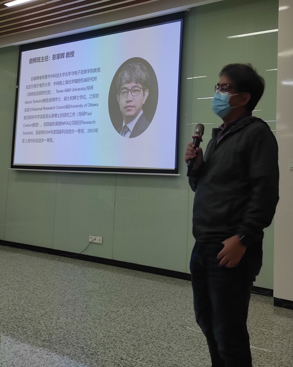 自我介绍结束后,教师班主任彭家晖寄语光实2201班全体新生。他指出,大学生应注重综合能力的提升,保持良好心态,强健体魄,心怀天下,具备全球视野,勇攀科学高峰。他还特别强调,大学生要克己节制,切忌沉迷游戏,做到“精力旺盛,不贪喜好”。