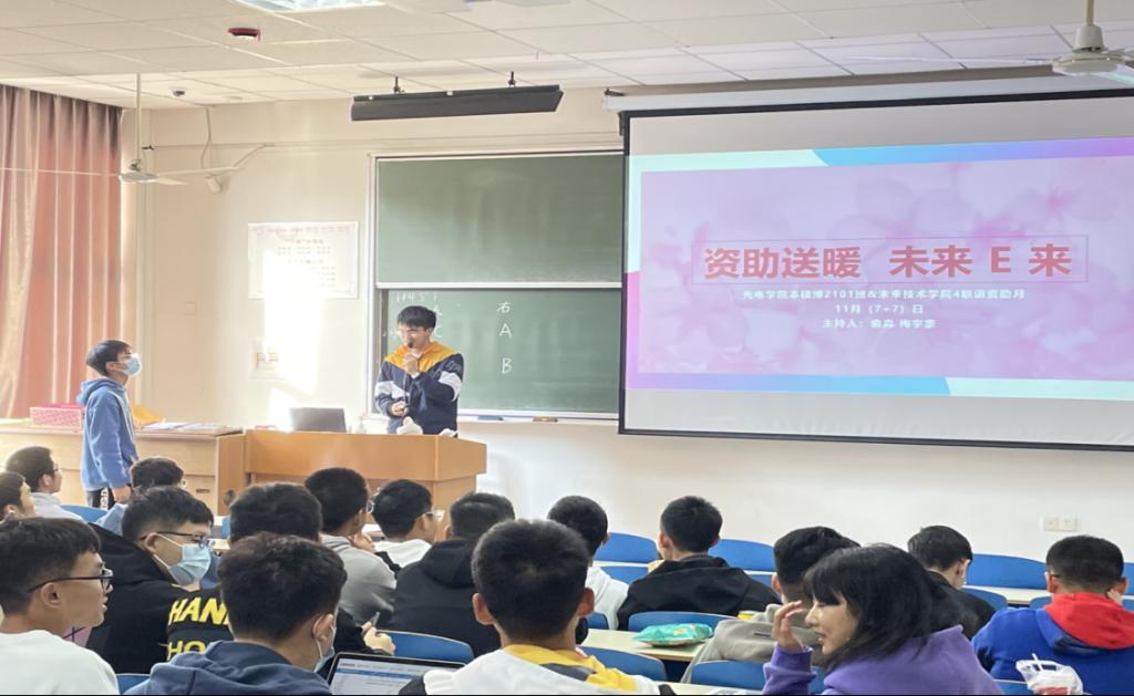 为了向同学们宣传资助政策,让同学们接触资助,走近资助,11月14日早上8点半,光电学院电子信息类本硕博2101班与未来技术学院4班在东十二楼203教室联合举办了以“资助送暖,未来E来”为主题的联谊资助月活动,由光电学院电子信息类本硕博2101班资助委员俞淼,未来技术学院4班资助委员梅宇豪主持。