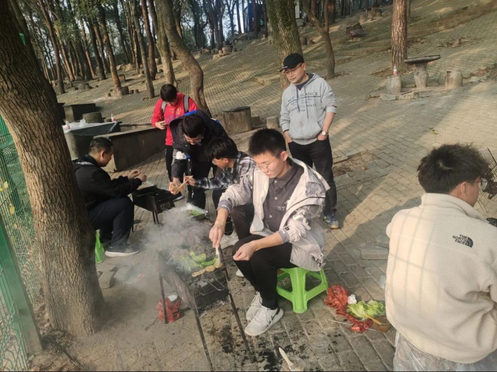 行过一程山路,探过一径通幽,同学们抵达了预定的活动地点。在这处背山临湖的疏林中,同学们稍作休整,便架起烤炉,亲手制作美味的午饭。同学们有的负责串肉,有的擅长烧烤,有的帮忙准备食材。虽经历些许波折与困难,但在大家的团结协作下,一道道色香味俱全的美食被同学们成功完成。炊烟阵阵,禽鸟与欢,同学们品尝着自己烤制的肉串与蔬菜,切身体会到了劳动的快乐与团结协作的重要意义。