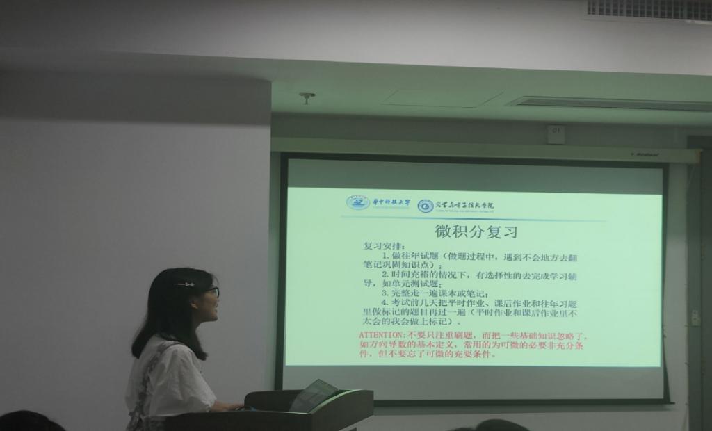 在同学们专注的目光中,四名同学分别对微积分、大学物理、电路理论和概率论与数理统计四门课的复习计划进行分享。