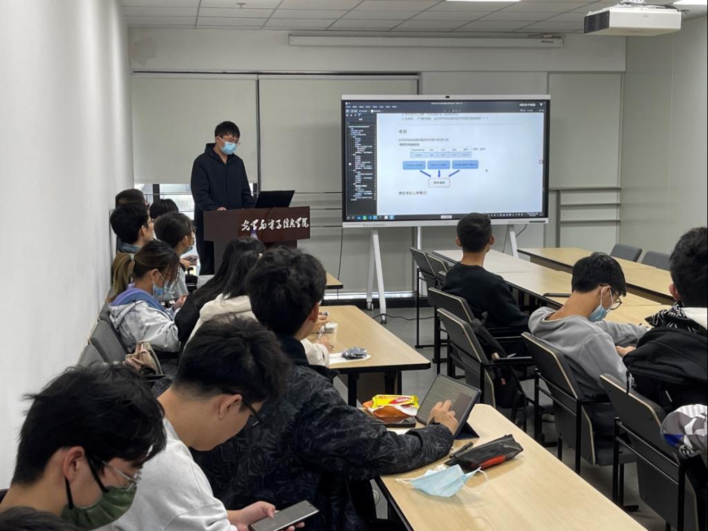 在同学们的分享过程中,辅导员朱教藤和教师班主任王韬老师提供补充说明,让同学对各种就业去向有了更深的理解。针对有些同学关于加权和绩点的疑惑,佘傲同学也提供了解答。此外,辅导员朱教藤还特别补充了我院近些年的深造情况,指出在近些年疫情影响下,就业、出国等形势严峻,学院也尽一切可能去帮助每位同学有更好的去向,帮同学们争取机会。王韬老师则以自身的经验出发,为同学们提供了相关指导。