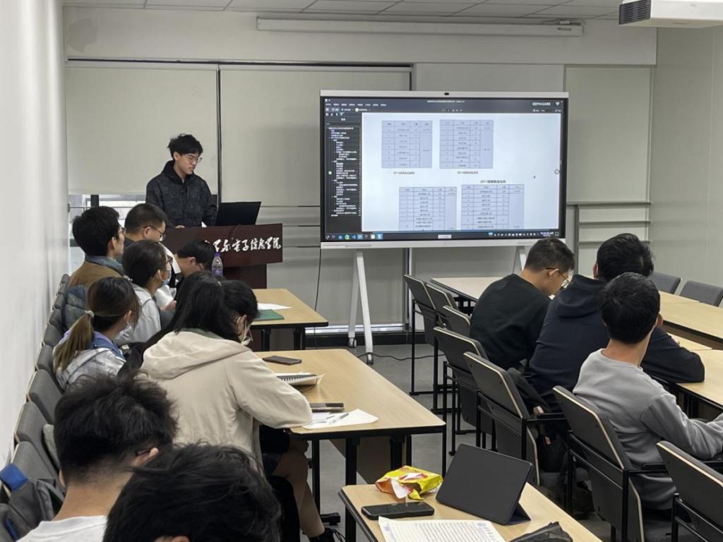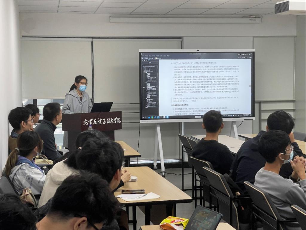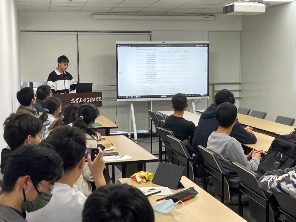 接着,佘傲同学针对就业这一毕业去向提供了自己的分析及意见。主要针对往届学生就业数据、个人就业观、就业信息渠道等进行了阐述。并且,他还就考公作了简单说明,指出考公的信息获取渠道、必要条件等。之后,由崔恒语同学介绍了保研的相关事宜,他指出,在日益严峻的考研形势之下,保研是继续深造的不错选择,且保研相对考研来说,在本科最后一年会比较空闲,有时间精力去做感兴趣的事。但保研的必要条件在于加权成绩、各种加分项以及信息的获取。接着,由刘兆坤同学就考研发表了自己的看法,他认为,保研会让自己面临着较大的学习压力,造成心理负担,考研的话固然辛苦,但这是大多数人继续深造的机会。他还就考研的流程与注意事项作了简单介绍。出国留学这一方向,由吴心怡同学作了介绍。她认为出国留学能拓宽自己的视野,并且国内外的科研环境有一定差异,在一些研究方向上,出国发展可能更具优势,但与此同时也可能伴随着生活习惯不同、缺少人脉等因素的影响,并指出国留学的必要条件是加权成绩、英语水平以及留学费用等。