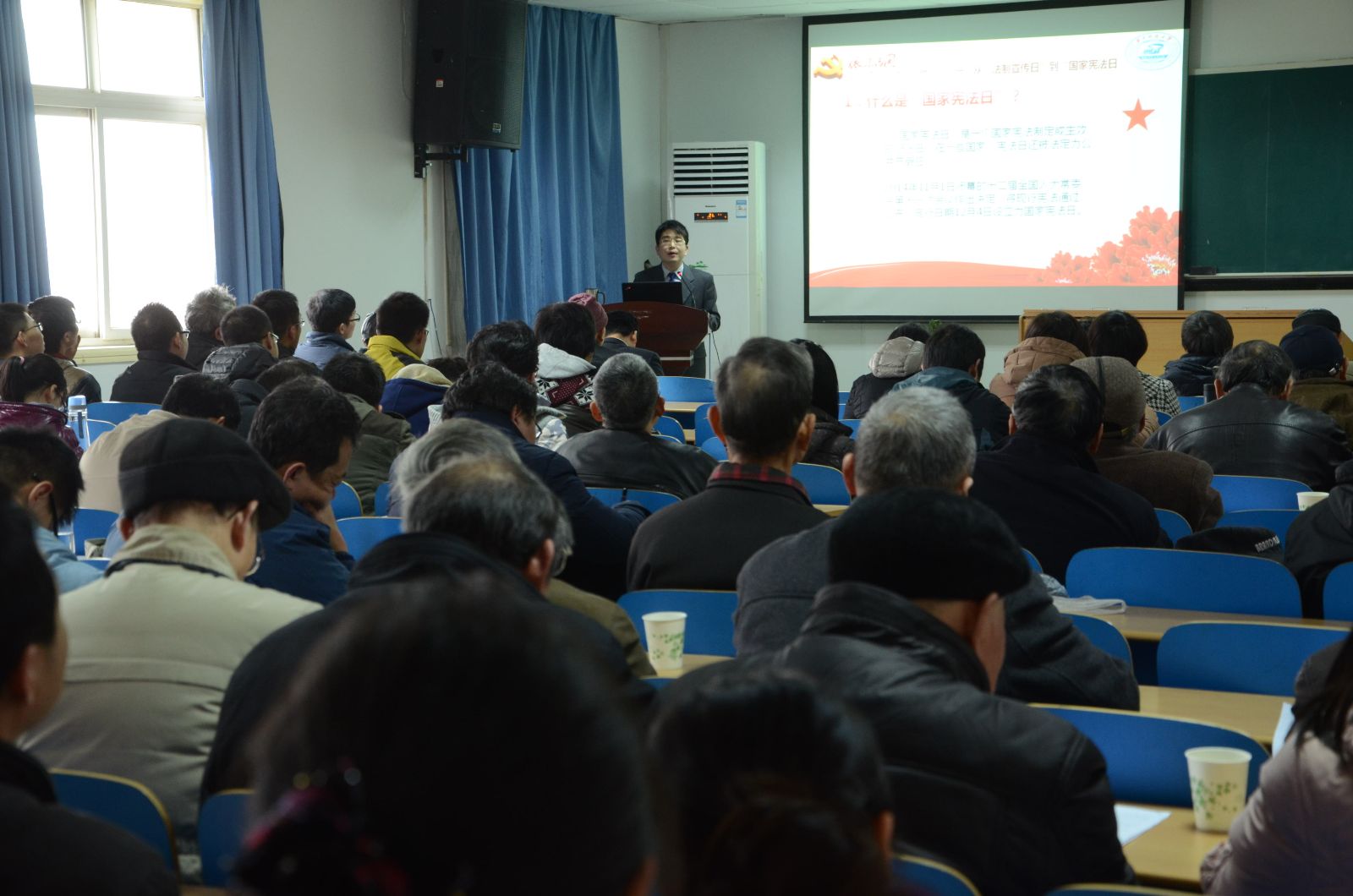 为深入学习贯彻党的十八届四中全会精神,根据我校学习贯彻十八届四中全会精神工作方案,2015年1月15日下午,法学院副院长焦洪涛副教授应邀在南五楼613学术报告厅为我院师生作了题为《迎接第一个“国家宪法日”的思考》的报告。我院在职教职工、离退休党员和学生党员代表共计一百余名师生代表参加了学习活动。报告会由学院党委书记刘继文主持。