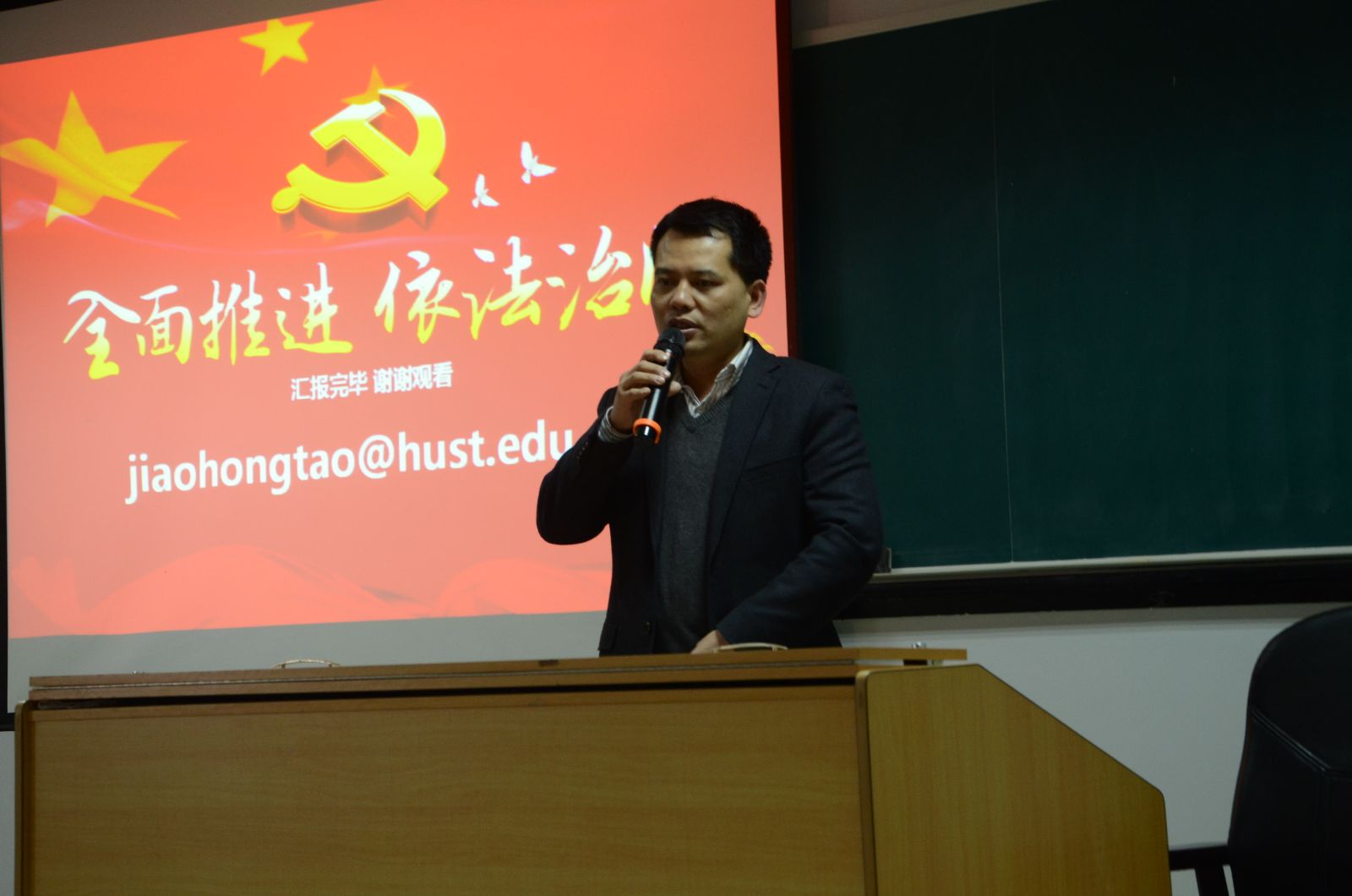 焦洪涛老师的报告共分为五个部分。首先,他用“错版的宪法纪念币”生动地阐述了法制宣传日与国家宪法日的区别,介绍了我国第一步宪法从颁布、修改、完善充实的历史脉络,从“法制宣传日”到“国家宪法日”的时代转变,讲述了设立国家宪法日的原因和意义。接着,他用“一个总目标、五个原则、五个体系、六项重大任务、四个第一次、五大看点、十大亮点”详细解读了十八届四中全会的主要内容;讲述了我国“以法治国—依法治国—依宪治国”的社会主义法治进程,阐述了“以法治国”和“依法治国”的区别以及背后不同的法治思维。最后,结合我校实际与《华中科技大学章程》,报告对依法治国与依法治校问题进行了详细的阐述。