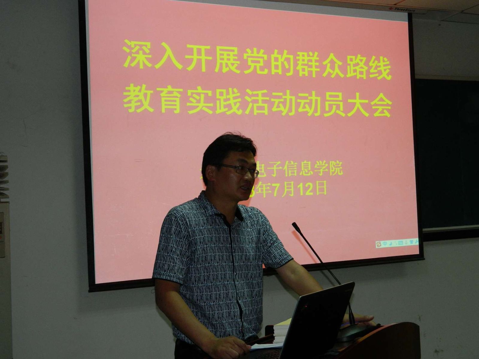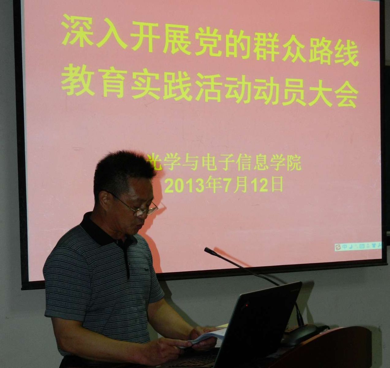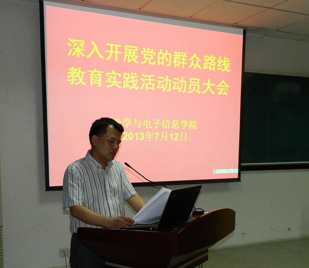 7月12日,光电信息学院召开深入开展党的群众路线教育实践活动动员大会。学校第二督导组组长、原软件学院党总支书记陈业美同志,督导组成员刘彬同志出席会议。我院全体教师党员、非中共党员的正教授、民主党派代表、离退休党员代表以及学生党支部书记参加了会议。学院党委书记刘继文做了《转变作风服务师生,真抓实干力促发展》的动员报告,院长张新亮主持动员大会。