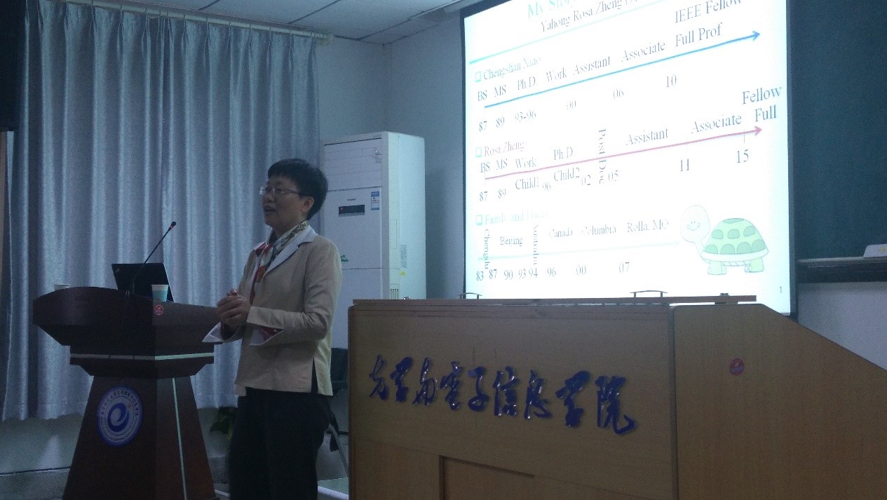 2017年3月30日,美国密苏里科技大学Yahong Rosa Zheng(郑亚虹)教授受刘德明教授邀请来到我院进行学术访问和交流。30日上午10点,郑教授在南五楼613会议室面向光电学院师生70余人做了题为《水下无线通信:概述及最新进展》的专题报告。付松年教授代表学院对郑教授的来访表示热烈欢迎。作为杰出的女性科研工作者,郑教授首先风趣地介绍了自己的人生履历及夫妻两人共同成为IEEE Fellow的成长历程,在场师生无不深受感染。之后郑教授生动详细地介绍了水下无线通信的需求及发展现状,对比了声学、磁感应、光学3种通信解决方案的优劣,针对声学通信方案的信号处理需求讲述了几种Turbo均衡方案,并介绍了基于声学和磁感应方法的现场试验及海洋实验的结果。在讲述的过程中,郑教授展示了若干自主研发成果实物并交给在场师生传看,与在场师生互动频繁,现场气氛十分热烈。