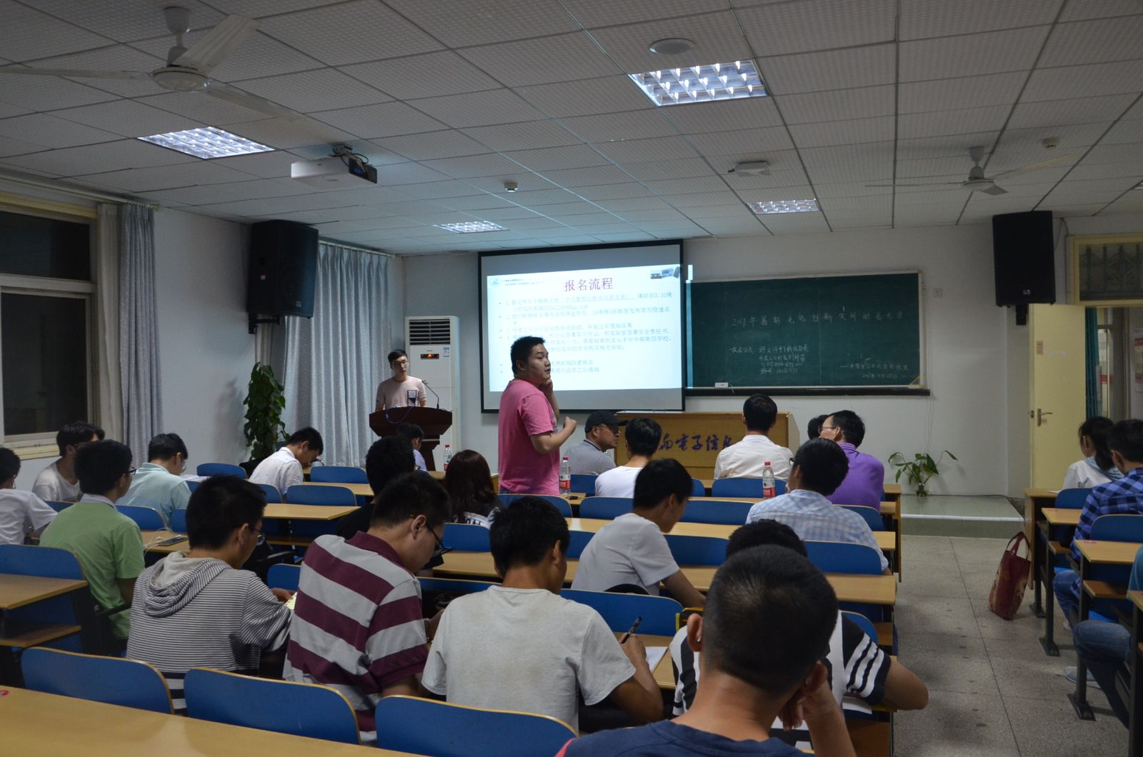 5月25日晚,光电信息学院大学生公共项目实验室(以下简称实验室)学员2017年暑期赴企业开展深度光电创新项目实训动员大会在南五楼613室召开。实验室大部分新老学员和实验室管委会成员及部分光电14、15、16级的同学参加了会议。大会很荣幸地邀请到了实验室暑期实训的优秀合作企业代表----武汉光驰教育科技股份有限公司的李小红总经理、武汉绝顶光电科技有限公司的刘定胜总经理作为嘉宾出席了大会。实验室邓前松老师、郑立新老师参加了会议。实验室学生管委会联络专委光电1501班宋瑞祥同学主持了讲座。