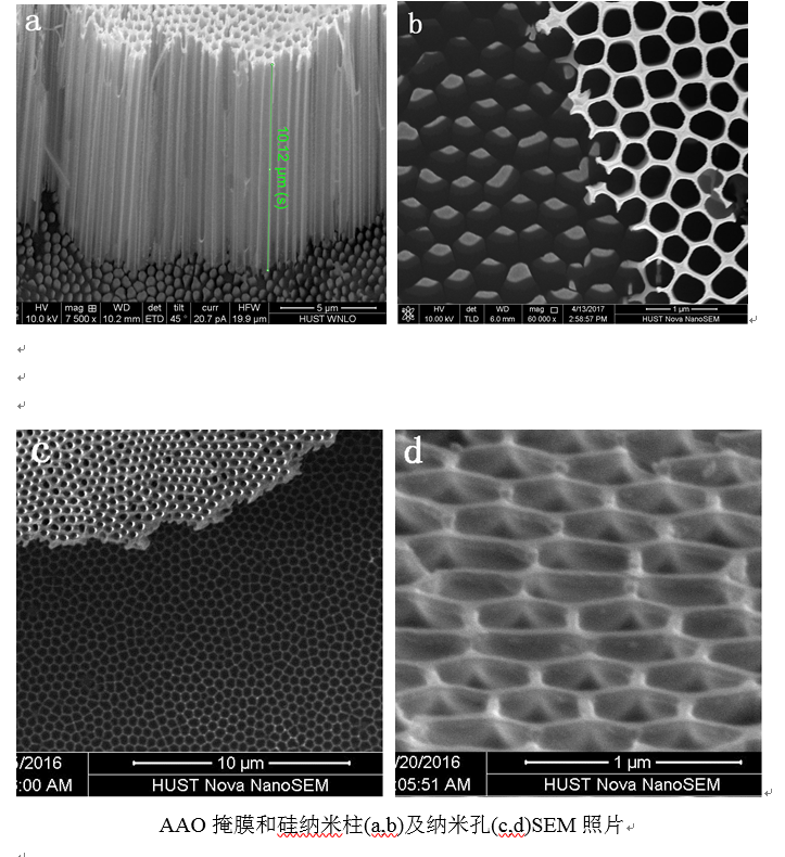徐智谋教授团队采用人工生成的纳米多孔阳极氧化铝AAO为掩膜来制备半导体表面有序纳米结构阵列。解决了纳米孔径(20-500nm)的调控、AAO掩膜与半导体表面吸附等一系列关键问题,尤其是,突破了厚膜AAO作掩膜的关键技术。AAO掩膜刻蚀技术,通常采用AAO薄膜(200-1000nm)进行的,但由于AAO膜薄,机械强度低、易脆,通常只能完成较小有效面积如2CM*2CM面积尺寸的掩膜板制备。厚膜AAO掩膜刻蚀技术的突破,膜厚度可达10微米以上,具有机械强度高,可实现大面积如2~4英寸及以上掩膜的制备。该技术的发现与突破,将使半导体表面大面积低成本有序纳米结构阵列的制备成为可能,对推动纳米结构半导体器件的应用意义重大。采用厚膜AAO掩膜刻蚀技术制备的硅纳米孔和纳米柱结构如下图所示。