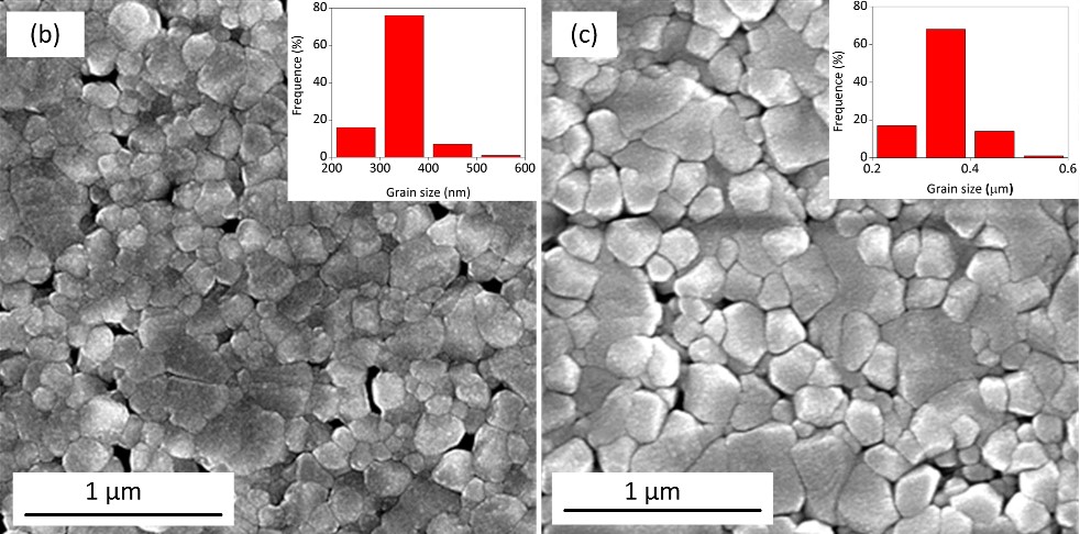 图 2(a)两步烧结与常规烧结效果对比; (b)第一步990?C烧结10分钟,平均晶粒约340nm,相对密度76%;(c)降温至940?C继续烧结,平均晶粒约348nm,相对密度85%