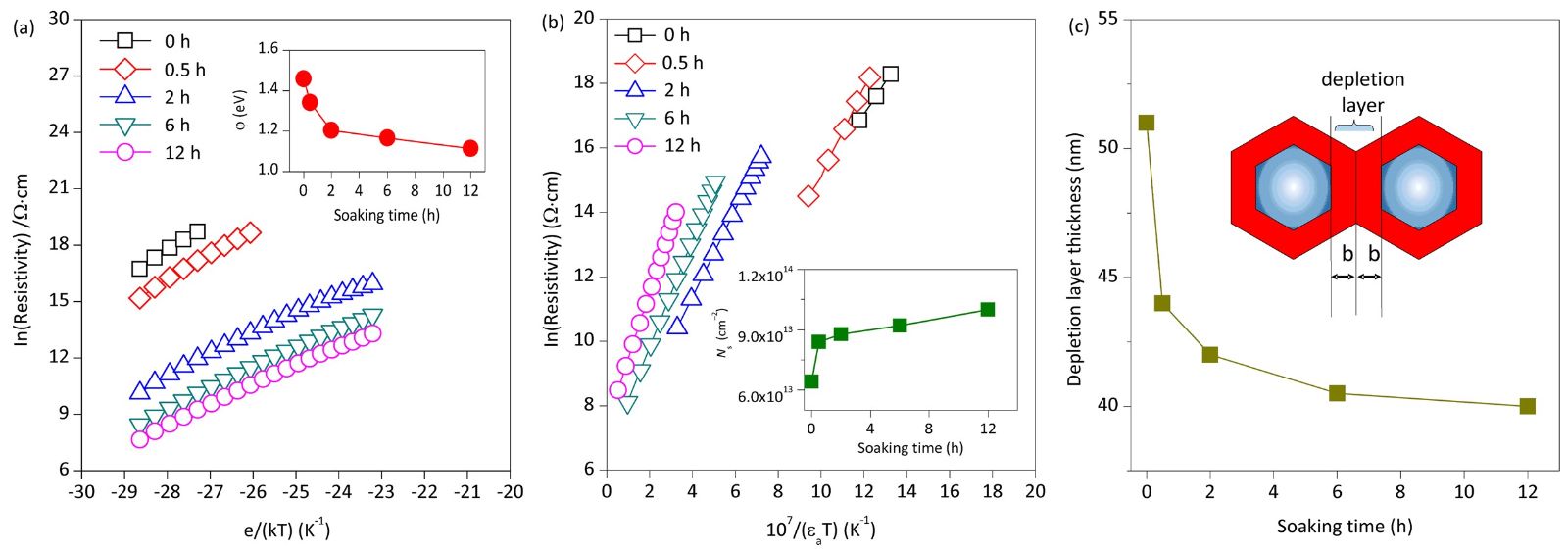 (a)势垒高度(小图)(b)受阻态密度(小图)(c)耗尽层宽度