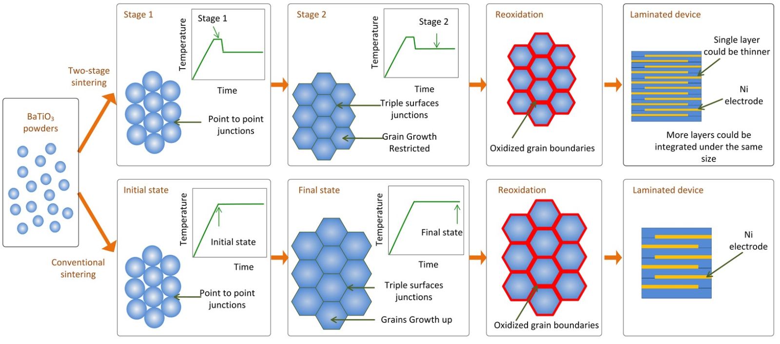 以上工作中晶界再氧化势垒重建模型以题为Abnormal reoxidation effects in Ba-excess La-doped BaTiO3ceramics prepared by the reduction-reoxidation method发表在Journal of the American Ceramic Society上,第一作者为博士生祖昊;两步法制备纳米晶陶瓷材料的工作以题为Nanocrystalline semiconducting donor-doped BaTiO3ceramics for laminated PTC thermistor发表在Journal of the European Ceramic Society上,第一作者为博士生高超,通讯作者均为傅邱云教授。