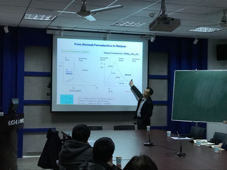 2016年12月14日,受我院姜胜林教授的邀请,加拿大西蒙-菲舍尔化学系叶作光教授来我院进行学术交流访问。于14日下午4点,在南五楼612学术报告厅作了题为“钙钛矿无铅压电材料中的铁电-弛豫的转换与再入现象”的学术报告,并与到场师生进行了深入交流。