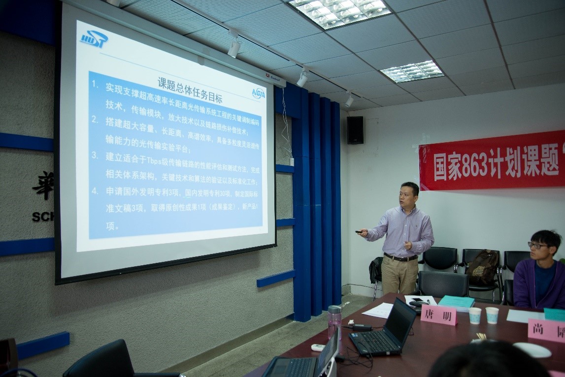 会上,课题负责人光电学院唐明教授汇报了本课题自2013年实施以来任务完成的总体情况,详细介绍了在新型T比特级超高速长距离光发射与解调技术、高性能链路放大技术、光传输链路性能在线监测、光链路损伤高精度多通道补偿技术、性能评估参数与测试方法研究等方面所取得的成果,并向专家组成员现场展示了所搭建的超高速率大容量光纤传输系统平台及相关核心技术和器件。