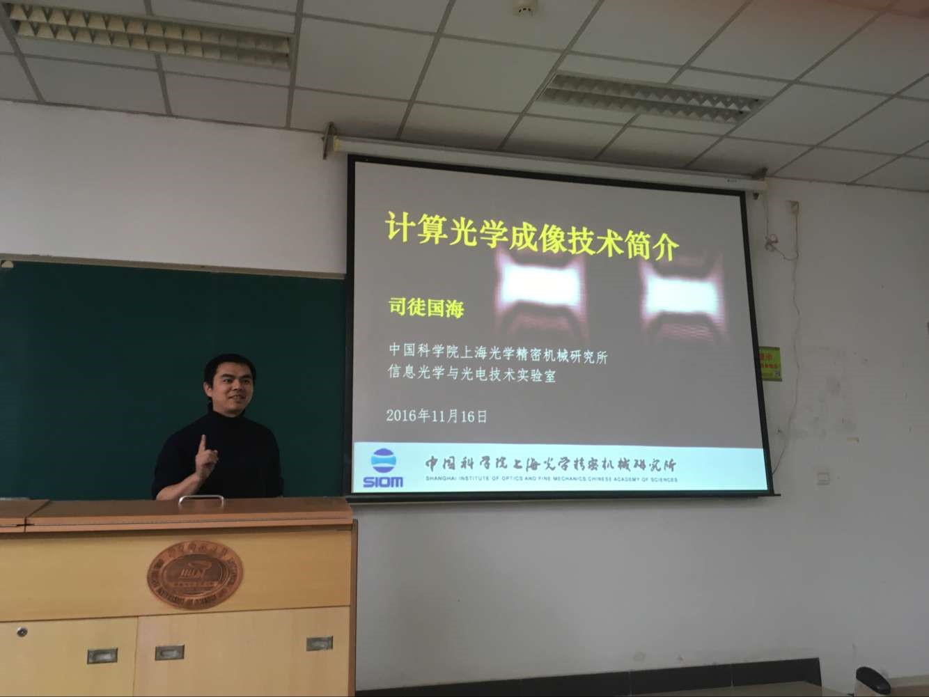 2016年11月16日,受我院彭家晖教授邀请,中国科学院上海光学精密机械研究所司徒国海研究员来我院进行学术交流访问,于16日下午2点,在东九楼D311室做了题为“计算光学成像技术基础及进展”的学术讲座, 并与到场师生进行了深入交流。