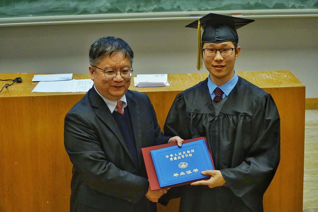 学位授予仪式在悠扬的音乐声中缓缓拉开序幕,19位同学身着学士服,依次上台从张晓东副院长手中接过华中科技大学本科学位证书。巴黎南十一大学Sandrine Lacombe副校长和张晓东副院长与每一位毕业生合影留念。