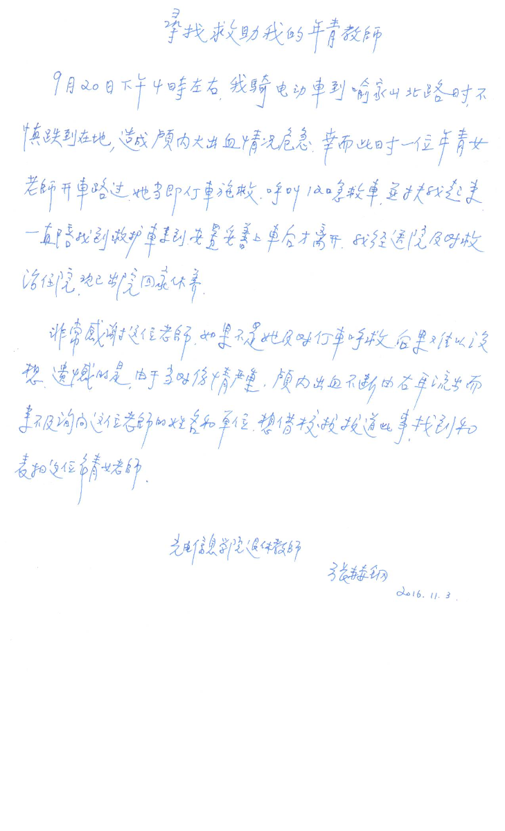 张老师非常感谢这位善良的女老师,如果不是她及时停车呼救,后果难以设想。遗憾的是,由于当时张老师伤情严重,颅内出血不断,意识模糊,未能询问这位老师的姓名和单位,现想借助网络报道此事,宣传这位女老师的好心行为,希望能找到她并当面致谢。