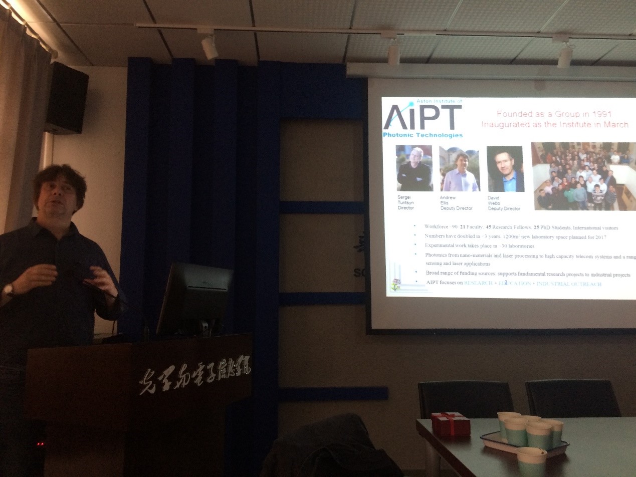 2016年11月2日,受我院孙琪真教授和闫志君副教授邀请,英国阿斯顿大学光电子技术研究所Thomas Allsop博士来我院进行学术交流访问。2日上午10点,Thomas Allsop博士在南五楼613会议室做了题为“Fiber optic sensing: Possibilities and Applications”的学术讲座, 并针对光纤传感当中的光栅解调系统和光纤表面等离子体与与会师生进行了学术交流。Thomas Allsop博士首先和与会老师讨论了光纤传感的一些前景和方向。报告开始后,他首先介绍了一种用于简便的,高精度的用于测量光栅应力变化的一种解调装置。基于该解调装置,Thomas介绍了他利用光纤光栅和一种特殊的树状应力传导结构实现了一种可对人体呼吸运动的监测和局部胸椎运动的监测的系统。通过不同点处应力的变化,经过特定算法处理后即可实现对胸腔运动状态的恢复。在报告中所展示的3D运动恢复效果让许多师生都非常感兴趣,Thomas与大家进行了热烈的讨论。其次,Thomas介绍了光纤与表面等离子体结合从而进行气体传感的相关实验和应用。通过在D形光纤上镀金属膜,可以将将光信号从光纤纤芯导出,在金属膜表面形成倏逝波传输,从而增大光信号与气体之间的接触,提升传感灵敏度。最后Thomas介绍了将磁场信号转换为轴向应力再利用长周期光栅进行传感的一种有趣的应用案例。