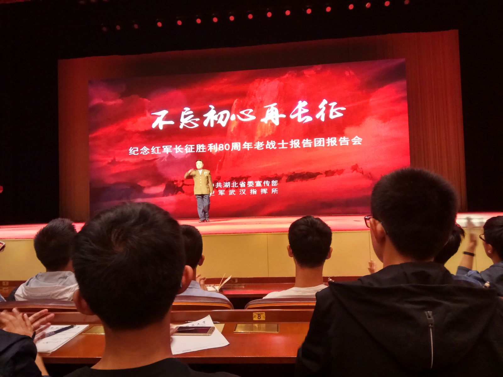 10月17日,湖北省“不忘初心再长征——纪念红军长征胜利80周年老战士报告团报告会”在武昌洪山礼堂举行。5位老战士报告团成员讲述了老一辈革命家的长征故事,分享了自己对长征精神的感悟。报告会由省委宣传部、空军武汉指挥所联合主办,我院百余名师生到场聆听报告,感悟无产阶级革命先辈讲述的长征精神。