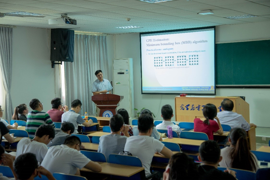2016年10月8日,受我院付松年教授邀请,香港中文大学信息工程系Calvin Chan Chun-Kit教授来我院进行学术交流访问。8日上午10点,Calvin Chan教授在东九楼D311教室,对我院研究生国家化全英文课程《宽带光接入网》中WDM-PON部分开展全英文授课。教学内容首先回顾现有基于时分复用的EPON和GPON中优缺点,指明了WDM-PON实现接入网带宽提升的重要性和必要性,讲授了WDM-PON中的关键技术,包括基于光频梳的密集多波长光源的产生,无色ONU的实现,结合其相关研究课题和前沿技术,介绍了下一代无源光接入网(NG-PON)的研究现状和未来的发展趋势。课程时长100分钟,内容精彩纷呈,Calvin教授热情洋溢、幽默风趣的授课风格不仅让我院研究生们留下了深刻的印象,也使他们有机会感受到了原汁原味的全英文教学。