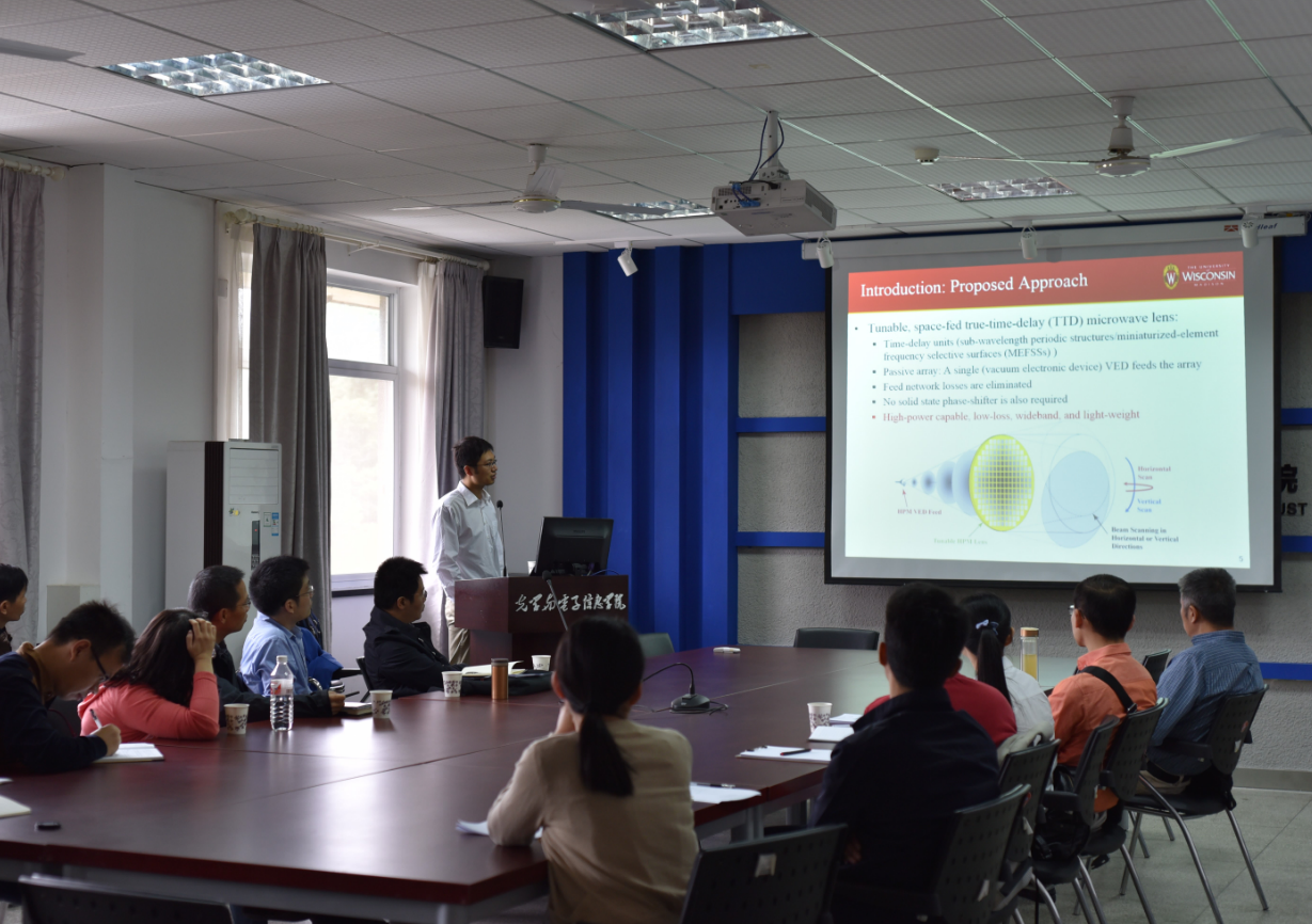 2016年9月29日上午,美国威斯康辛大学麦迪逊分校李孟博士在南五楼612报告厅做了题为“基于可调控频率选择表面的实时延高功率微波透镜技术”的学术讲座,并对相控阵天线以及灵活孔径天线技术的发展热点同与会师生进行了学术交流。