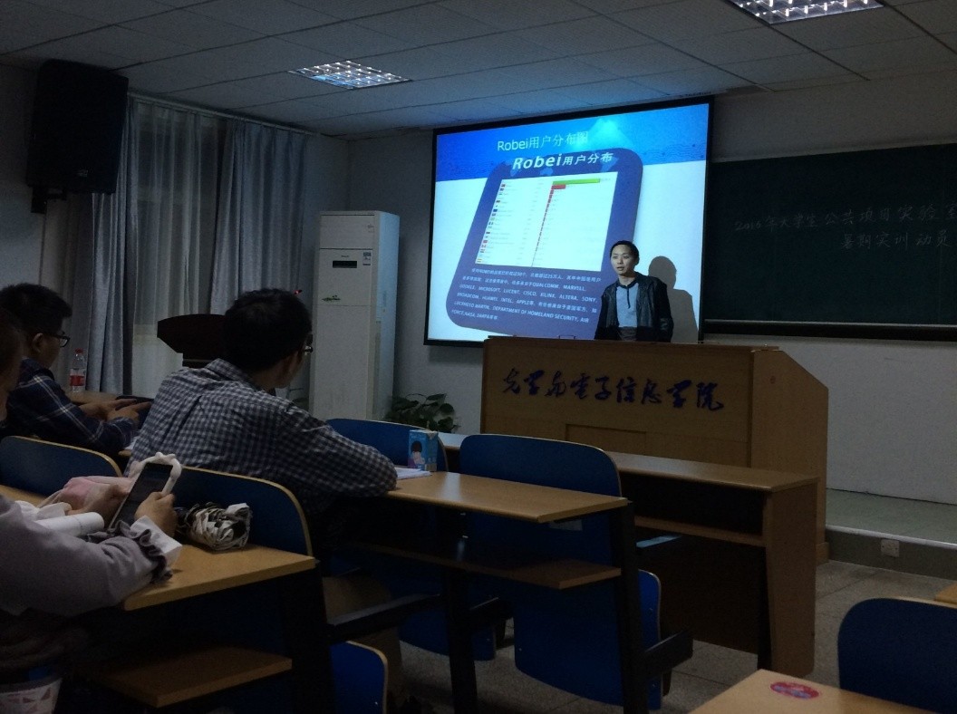 接下来,吴国盛总裁向同学们展示了若贝科技有限公司的主要精英成员、研发和培训实力。若贝作为一半员工来自于美国硅谷的高新科技产品研发的公司,拥有独特的项目设计理念和人才培养体系,已成功培养了两批创业人才(36 个创业实习生),吴总向同学们展示了这36个学生在实训中做出的项目成果(如曹为主团队的3D 显示蓝牙音箱),利用了一个暑假时间,共产生了4 个软件著作权(正在申请),6 个专利和一篇国际论文。同时,通过实例展示出这些培训后的精英们就业待遇超过了同年毕业的学生的平均待遇的2 倍。吴总生动且富有激情的演讲让同学们产生强烈的兴趣与期待能加入若贝的精英实训。