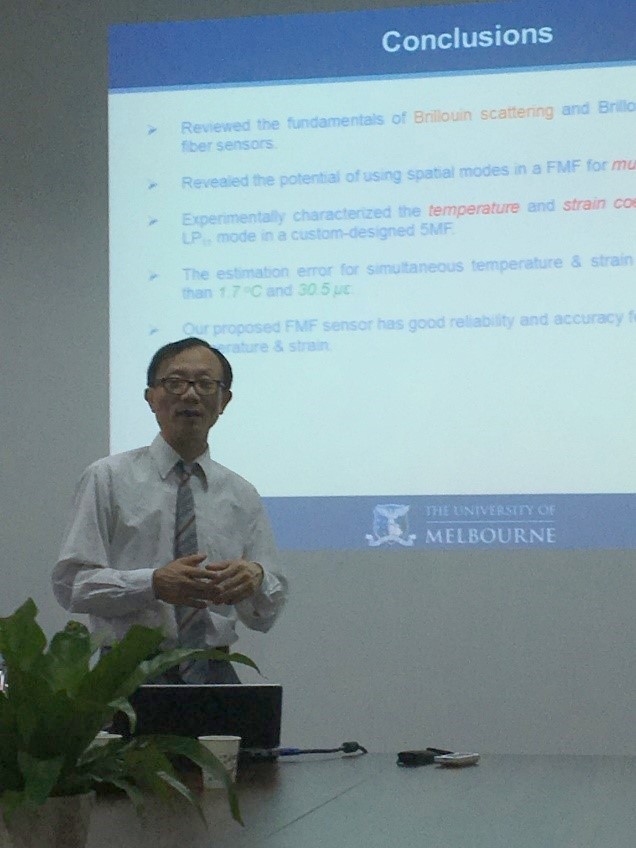 2016年5月26日上午,受我院付松年教授邀请,澳大利亚墨尔本大学电子工程系William Shieh教授在南五楼606会议室做了题为“Stokes vector direct detection and few-mode fiber sensors”的学术讲座, 并针对基于斯托克斯矢量的直接检测技术以及基于少模光纤的温度和应力分布式多参数光纤传感技术同与会师生进行了学术交流。