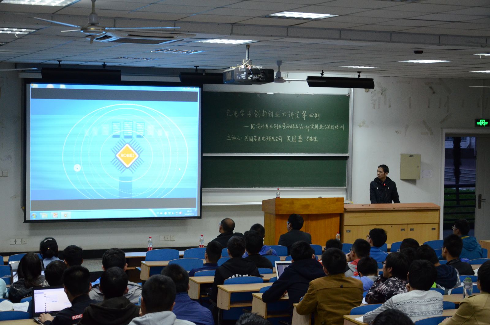 来自光电信息学院和校内其他兄弟院系的100多位本科生、研究生一起聆听了IC创业精英公共项目实验室首席企业兼职导师---美国若贝科技有限公司总裁吴国盛先生(毕业于美国丹佛大学,在硅谷工作6年,2013年回国创业,美国若贝EDA软件的主要开发人)带来的精彩讲座“IC设计专业创业经历分享与Verilog使用技巧的实战培训”。光电信息国家试点学院副院长杨晓非教授出席了讲座,学院教学实验中心陈晶田老师、大学生公共项目实验室邓前松老师、郑立新老师和余涛参加了讲座。公共项目实验室学生管委会联络专委电子1306班宋璐瑶同学主持了讲座。
