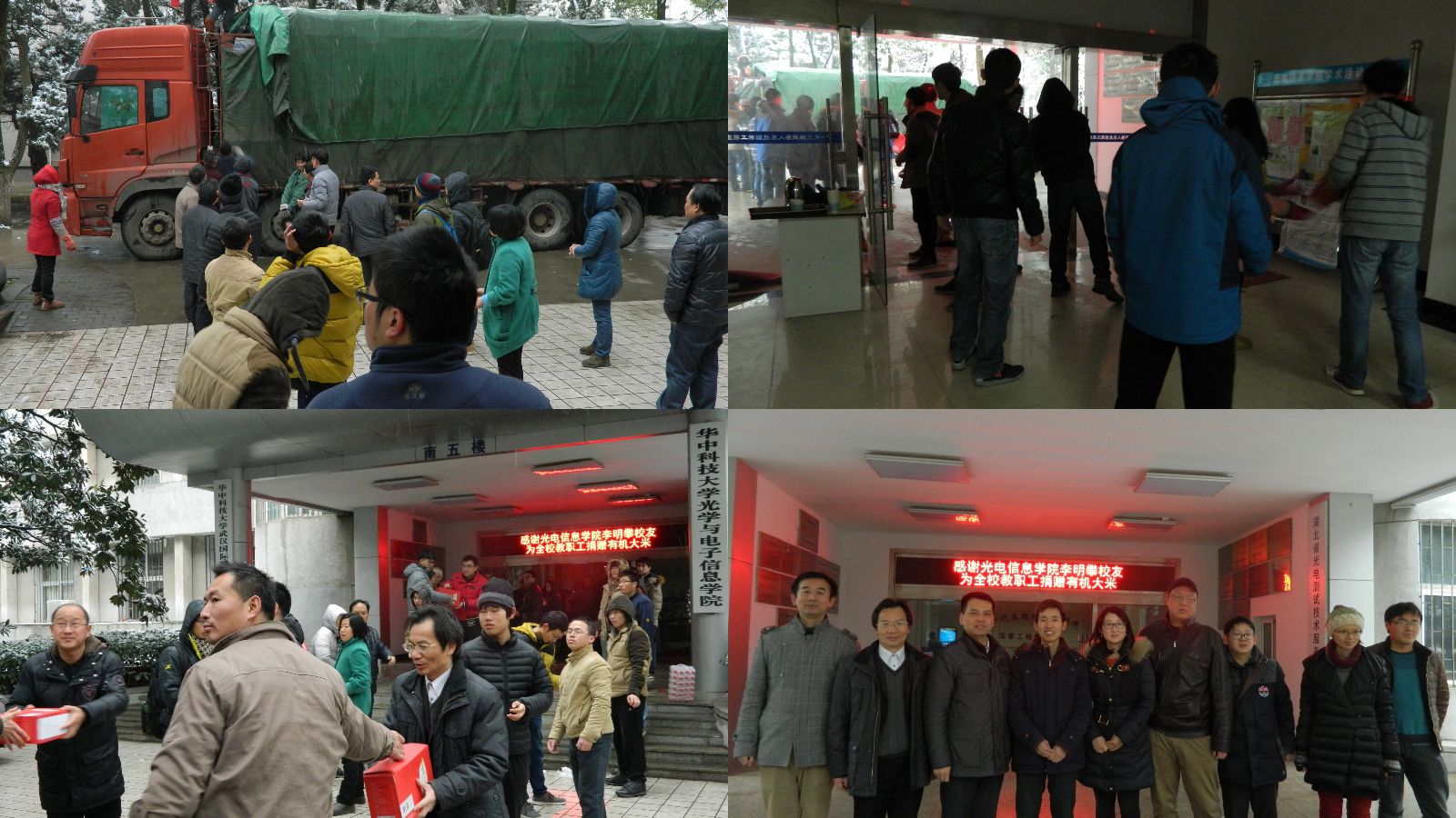 2016年1月21日凌晨3点,电子科学与技术专业971班的李明攀校友还在紧张的忙碌中,他为母校华中科技大学全体教职工捐赠的13000袋自己种植的有机大米陆续装上货车。凌晨4点,天空中飘着雪花,李明攀校友从农场的所在地黄梅县出发了,克服了恶劣天气的影响,上午8点,满载着感恩的大米的货车安全的停在了校工会的门口。经过短暂的休息,李明攀校友带着他的大米来到了他所毕业的光电信息学院南五楼门前,光电信息学院的刘继文书记、李玲副书记、唐霞辉主席密切关心着李明攀校友的动向,早早就在来到学院办公室等待着李明攀校友的到来。