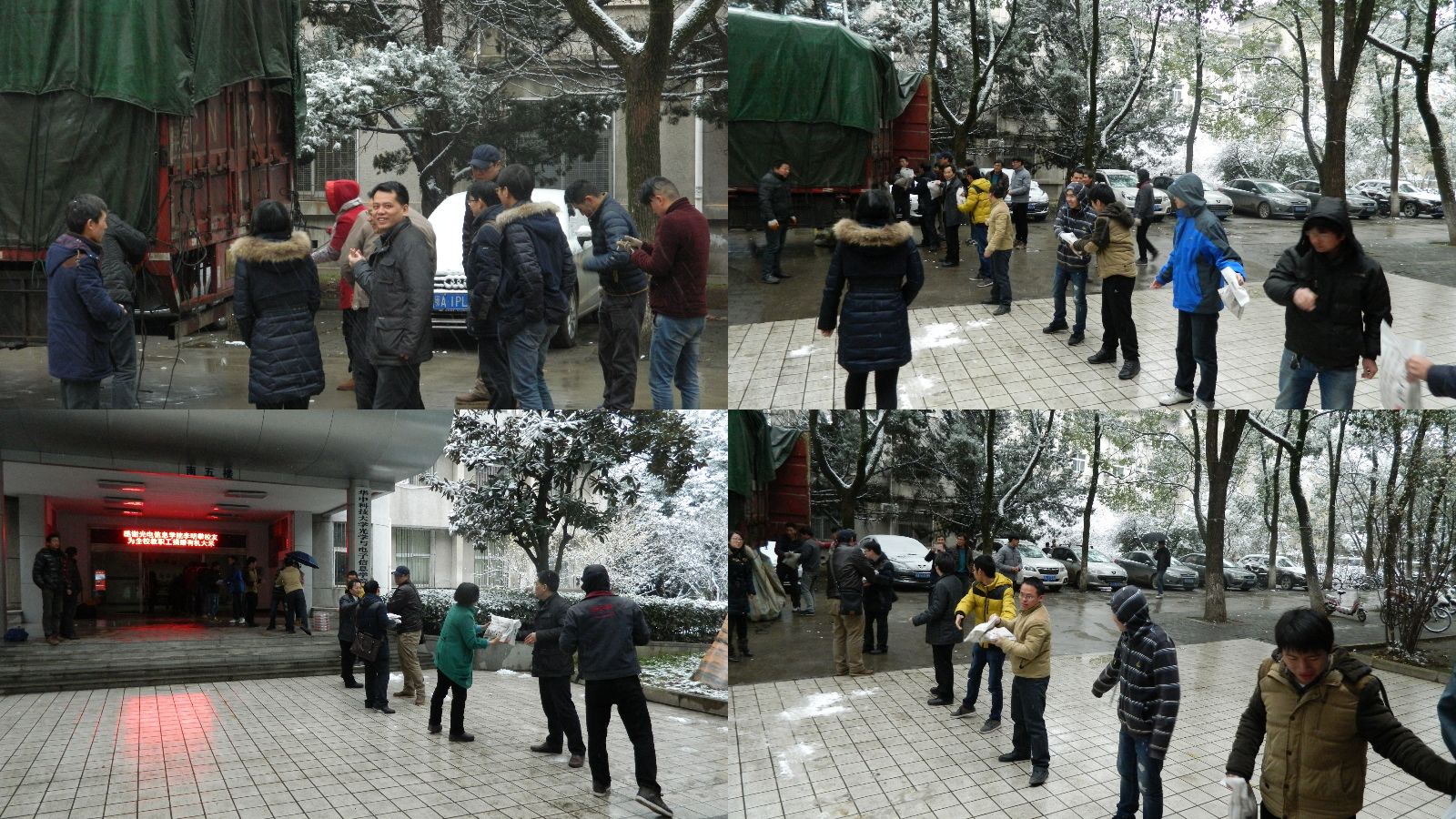 接下来,李校友将感恩的米带到了电信学院、自动化学院、计算机学院、法学院、机械学院等院系的大楼门前。由于时间紧,任务重,经过校工会领导商议最后将剩余的米送到了校工会集中发放。虽然每人只有5斤米,但是李明攀校友感恩母校的心,冒着雪将13000袋米送到母校的精神让我们深深的感动。大米有价,感恩之心无价。(摄影:张秉怡)
