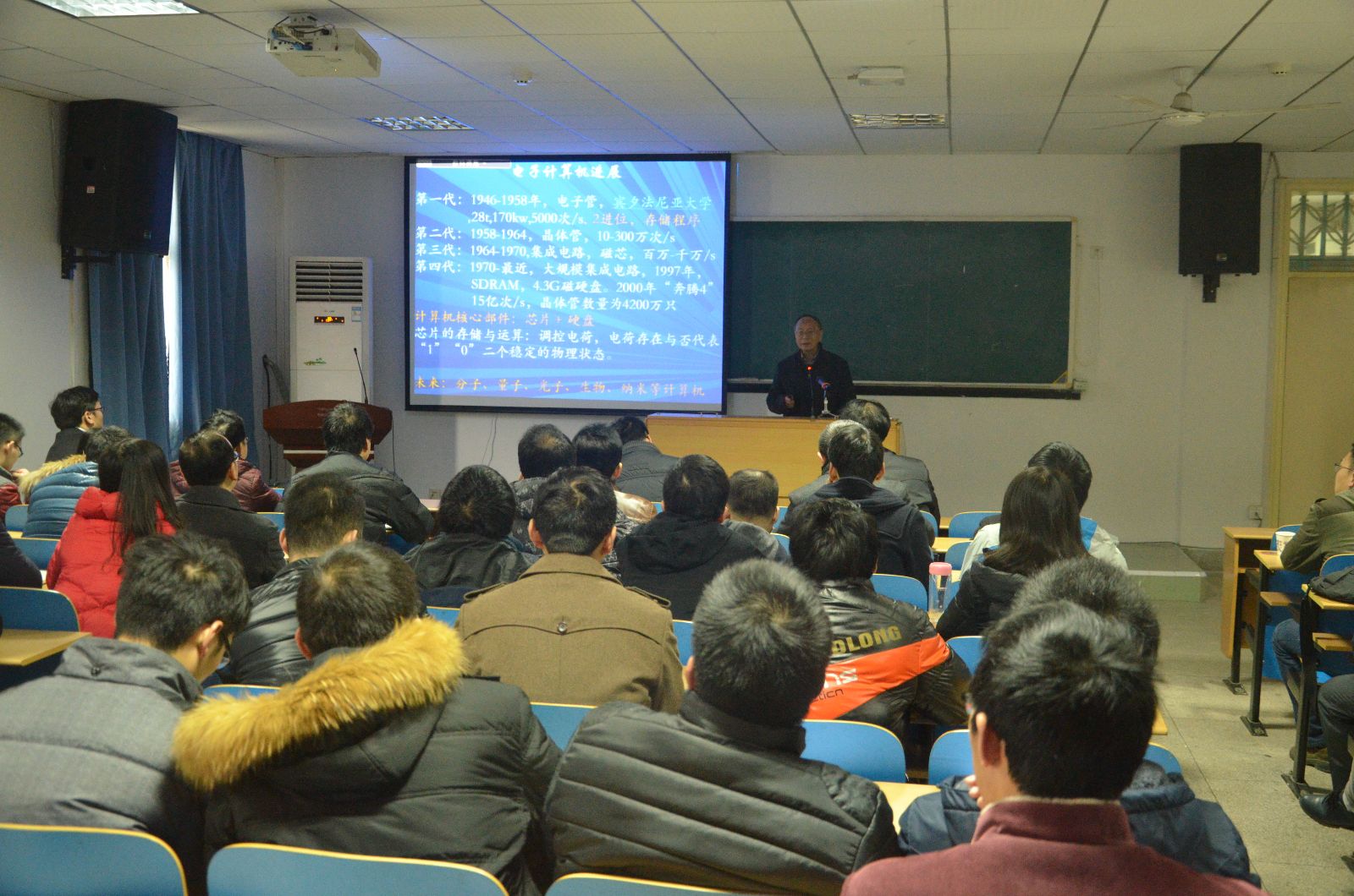 继授聘仪式之后,光电学院逾百名师生聆听了都有为院士题为《自旋芯片进展简介》的报告。 张新亮院长,刘继文书记、吕文中副院长、杨晓非副院长、江建军副院长、长江学者缪向水教授以及学院部分老师和研究生积极参加了此次报告会。报告会由吕文中副院长主持。在本次报告中,都院士从自旋电子学的核心思想出发,深入浅出地讲述了自旋电子学领域的一系列基础研究成果(包括巨磁电阻效应,隧道磁电阻效应,自旋阀巨(隧道)磁电阻效应,自旋转移力矩效应)的物理意义及其对电子信息产业的巨大应用价值,重点介绍了目前受到产业界极大关注的自旋转移力矩-磁随机存储器(STT-MRAM)的基本原理及国内外基于STT-MRAM效应的自旋芯片的研发现状。在报告最后,都院士预言了自旋电子学将很有可能引领第四次工业革命。