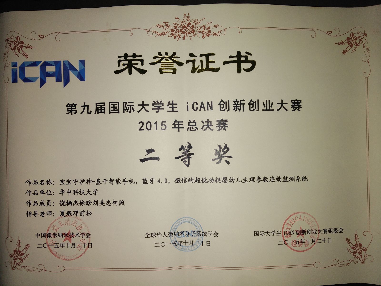在第一轮现场实物演示与答辩中,项目组成员和评委们积极互动,他们请评委体验测量血氧、心率和体温,引起了众评委的极大兴趣。在紧张的3分钟答辩环节,答辩队员对项目进行详细完整介绍,积极应对评委提问。最终,这支由光电信息学院大学生公共项目实验室学员光电12级本科生饶楠杰领衔本科生团队光弦项目组勇夺iCAN创新创业大赛中国总决赛二等奖。