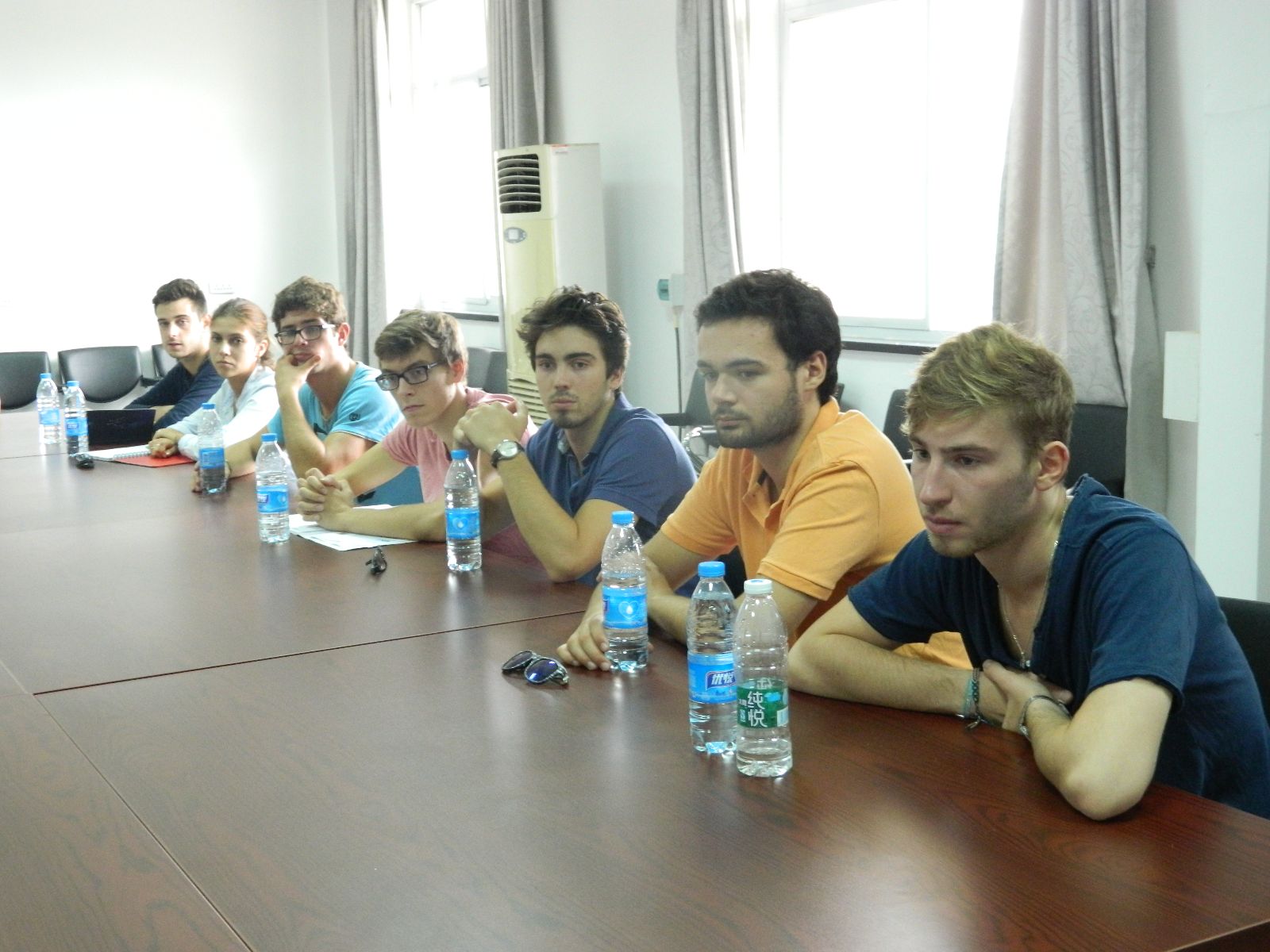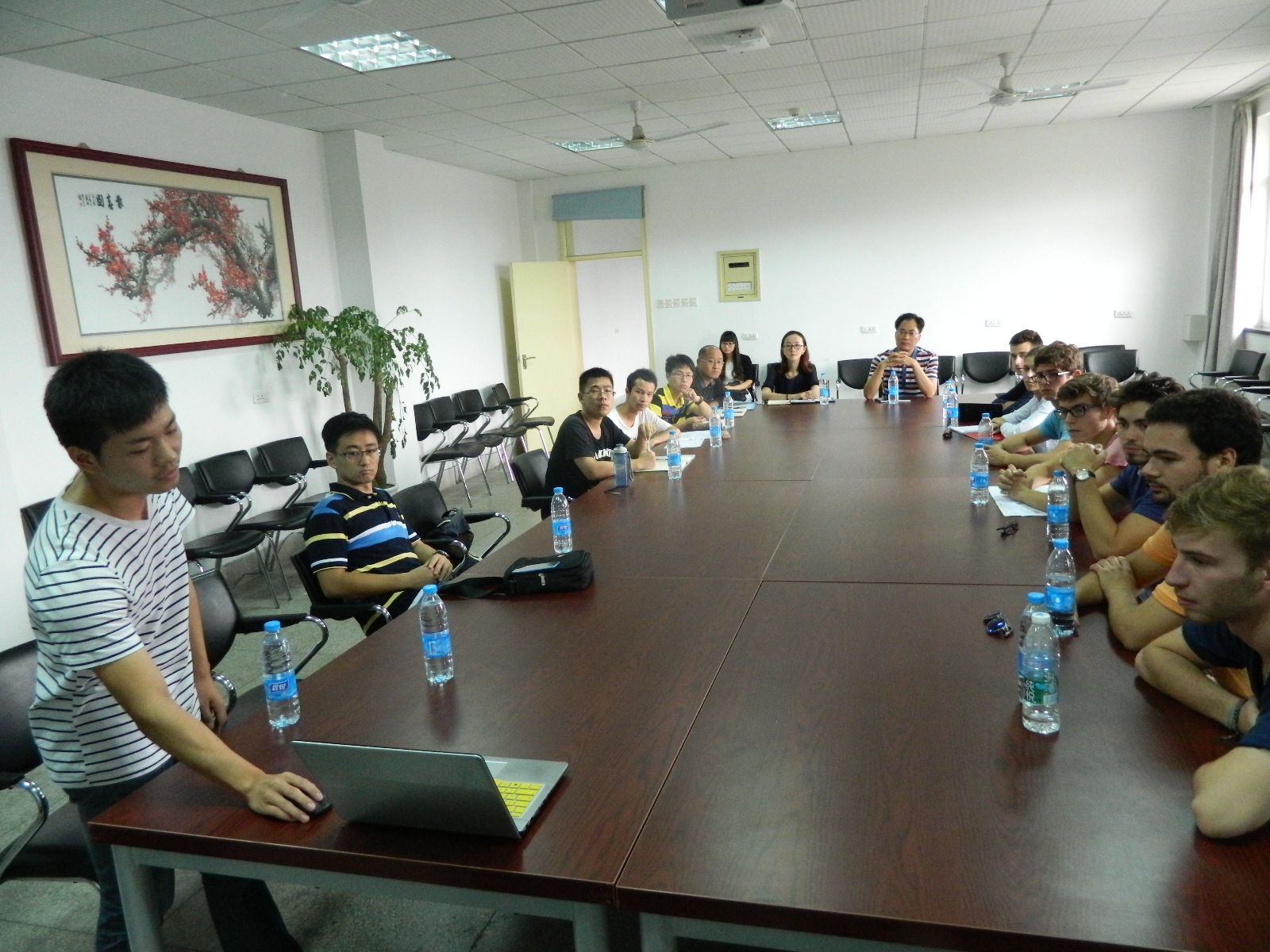 吕文中副院长介绍了学院的基本情况,对法国来华留学生表示欢迎。这8位同学将两两一组分成四个团队进行实习。在吕文中老师和王晓川老师的团队里同学们将接触到天线、GPS及微波器件的设计。在饶楠杰团队会参加到婴幼儿体温检测的项目,曹为主团队研究的是空间真实3D显示项目,并且准备了PPT演示,留学生们都非常感兴趣。