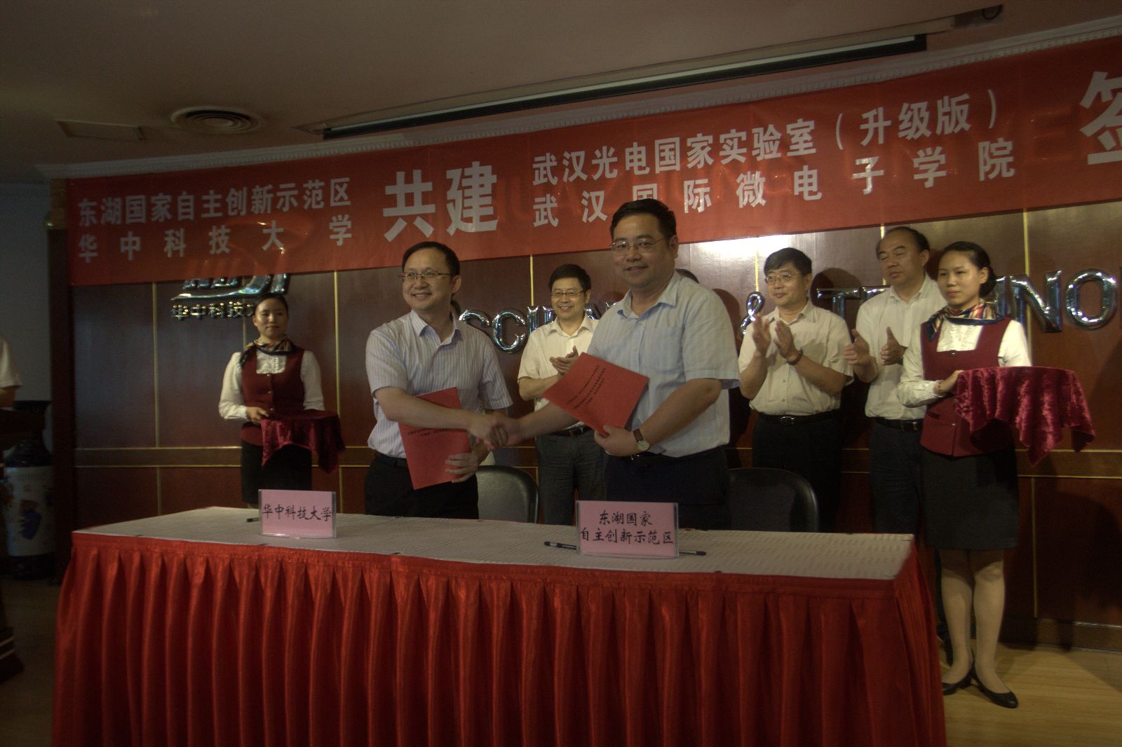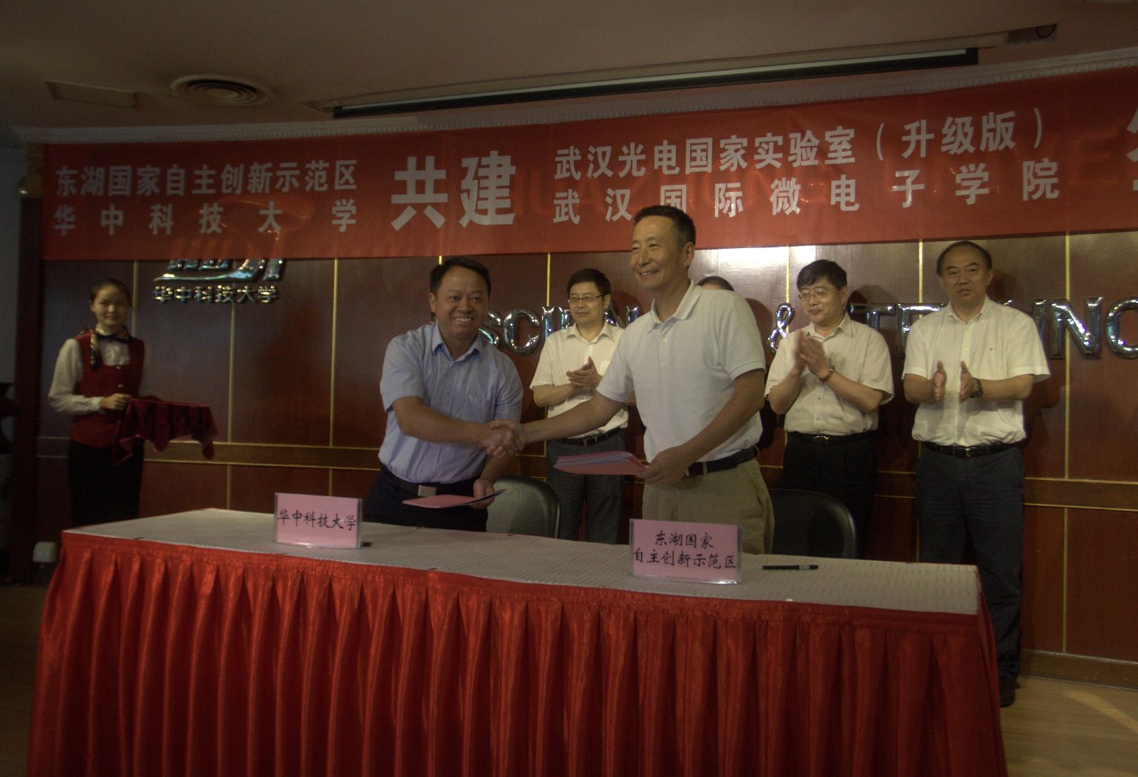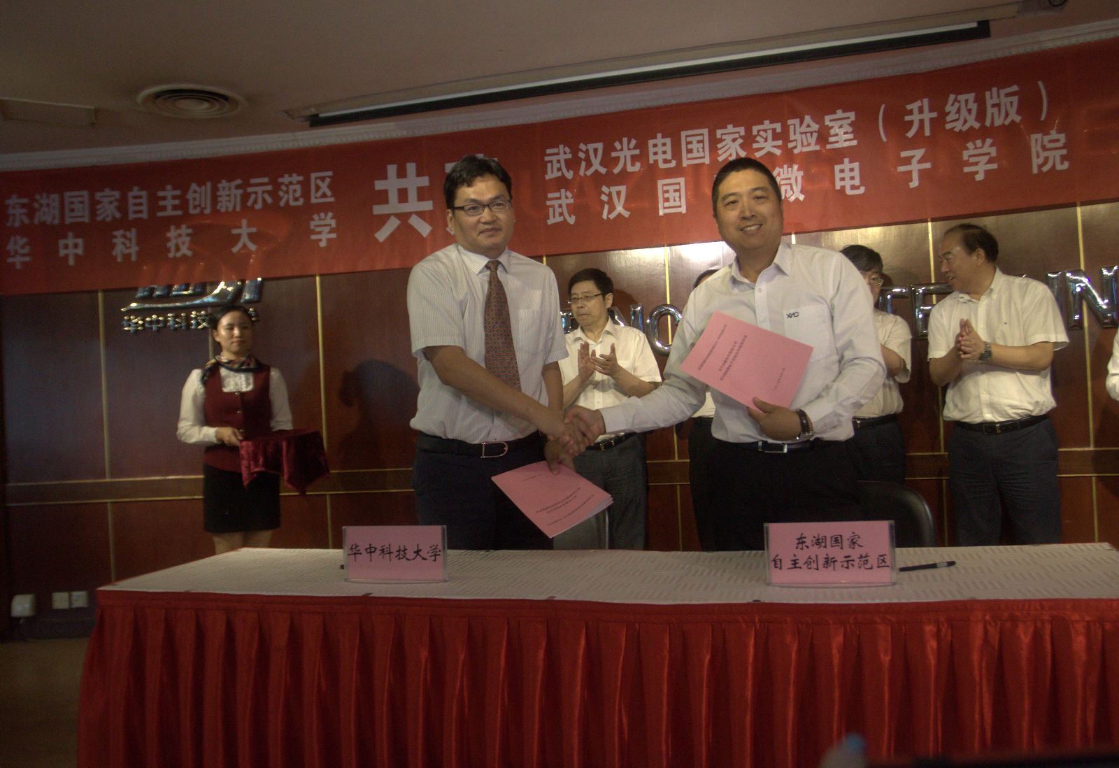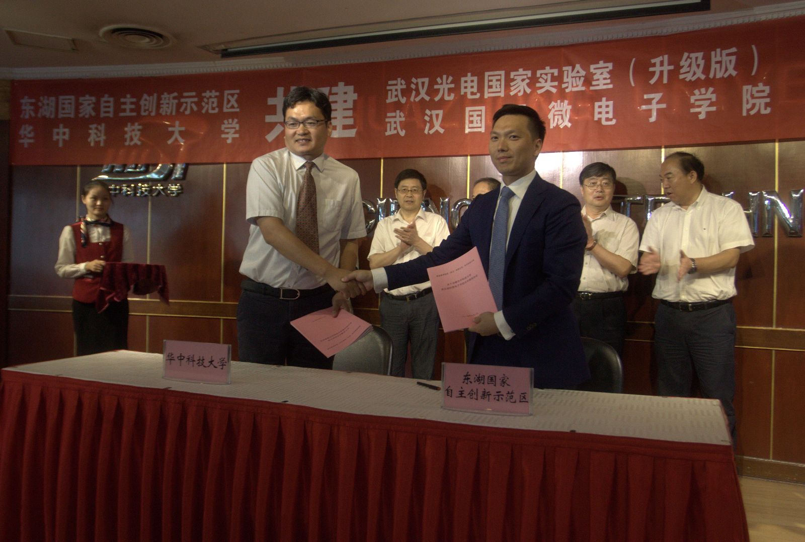 东湖开发区管委会副主任夏亚民与我校常务副校长段献忠签订《关于共建武汉国际微电子学院和推进武汉微电子产业发展的全面合作协议》。武汉新芯集成电路制造有限公司首席运营官洪沨、美国新思科技中国区总裁葛群分别与武汉国际微电子学院院长张新亮签订共建武汉国际微电子学院协议。