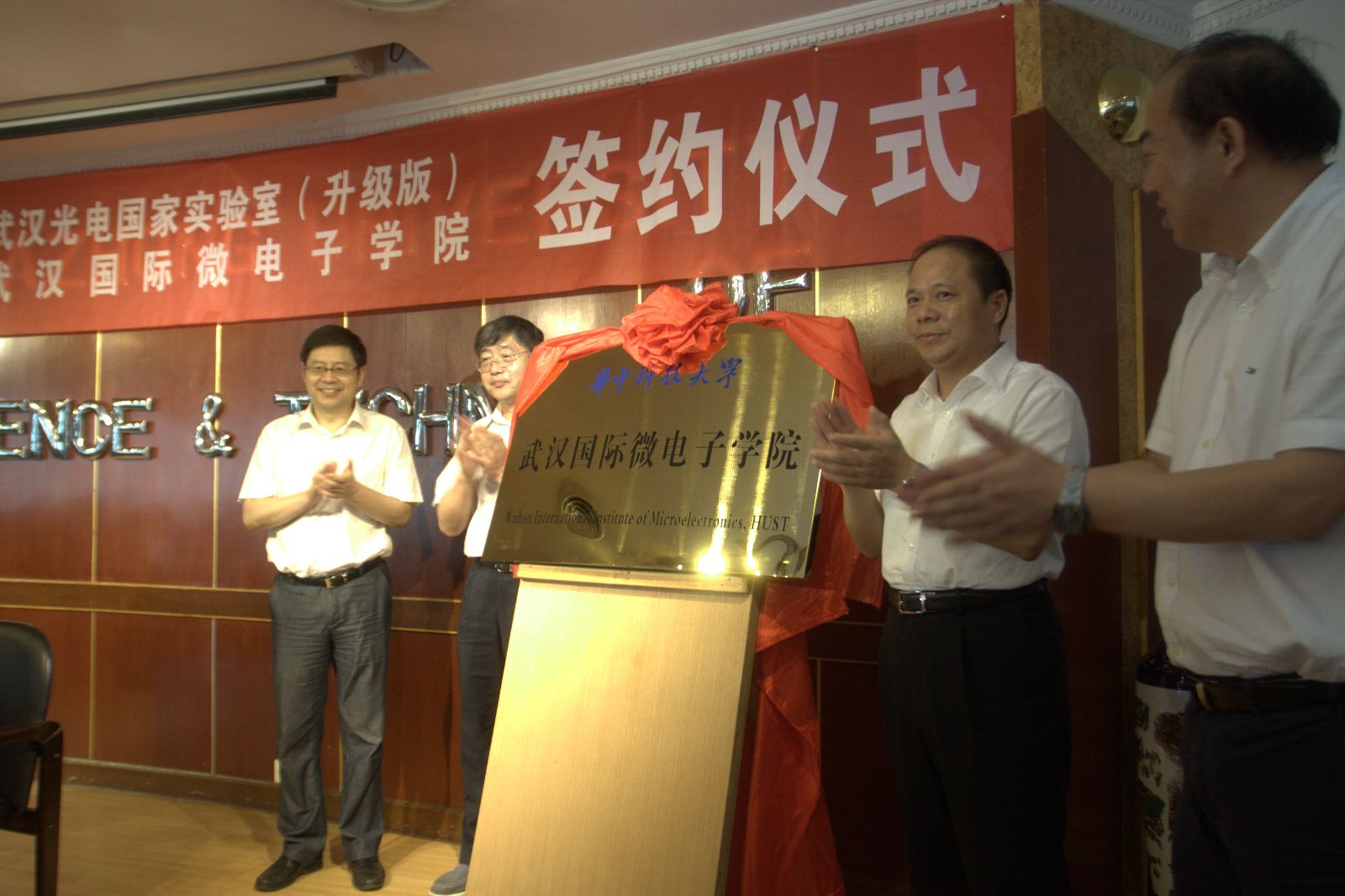 武汉市委副书记、市长万勇,武汉市委常委、东湖高新区党工委书记胡立山,我校党委书记路钢、校长丁烈云共同为武汉国际微电子学院揭牌。仪式由校党委副书记兼副校长马小洁主持,总会计师湛毅青,中科院院士、光电国家实验室主任叶朝辉等出席。