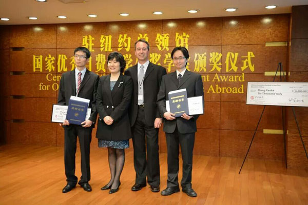 4月17日,中国驻纽约总领馆举行2014年国家优秀自费留学生奖学金颁奖仪式。章启月总领事出席颁奖仪式并为获奖学生颁奖,教育参赞徐永吉主持颁奖仪式。我院校友、麻省理工学院(MIT)张政博士喜获国家优秀留学生奖学金。