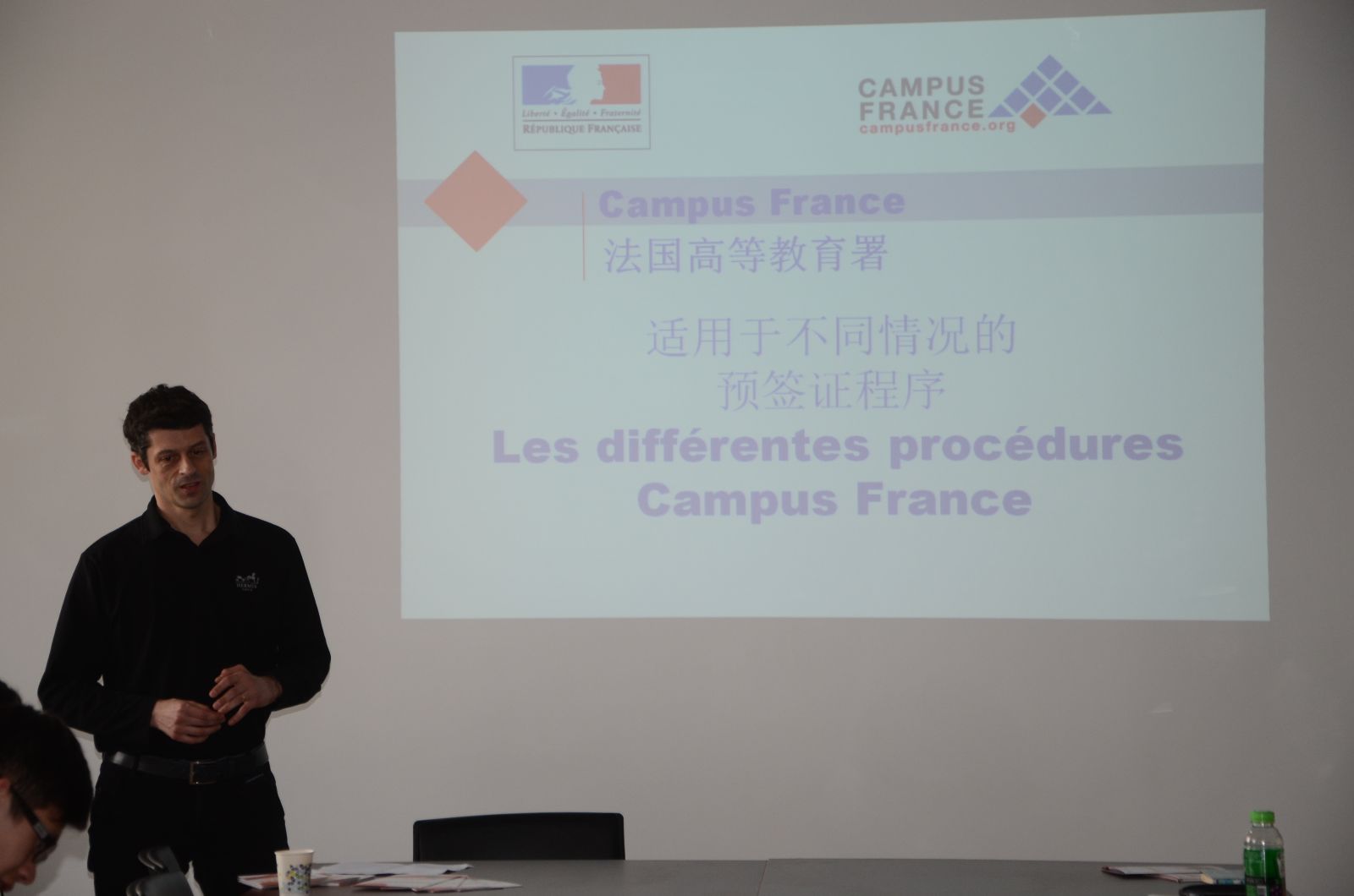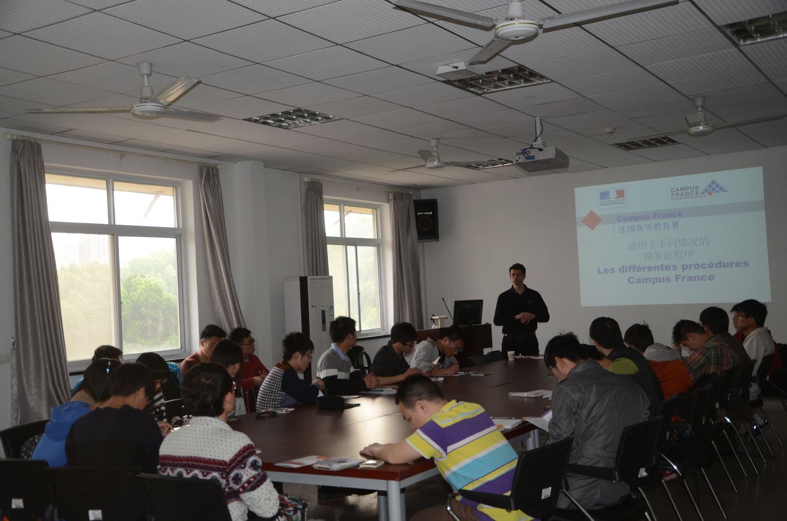 2015年4月21日下午,武汉法国驻武汉总领事馆流程管理与学生评审部负责人Olivier PEREZ先生来到我院亲自为我院中法班学生讲解留学法国的留学手续,PEREZ先生以流利的中文问好作为开场白后,分别用中文和法语向学生和老师介绍了留学法语所需要参加的法语语言考试以及签证面试和材料准备。讲座结束后,PEREZ先生非常耐心地回答了中法班学生提出的问题,并鼓励学生不要紧张,相信中法班的学生能有出色的表现。据悉,今年我院12级中法班有31名中法班学子被法国高校录取,即将赴法攻读硕士/工程师。(图:张秉怡)