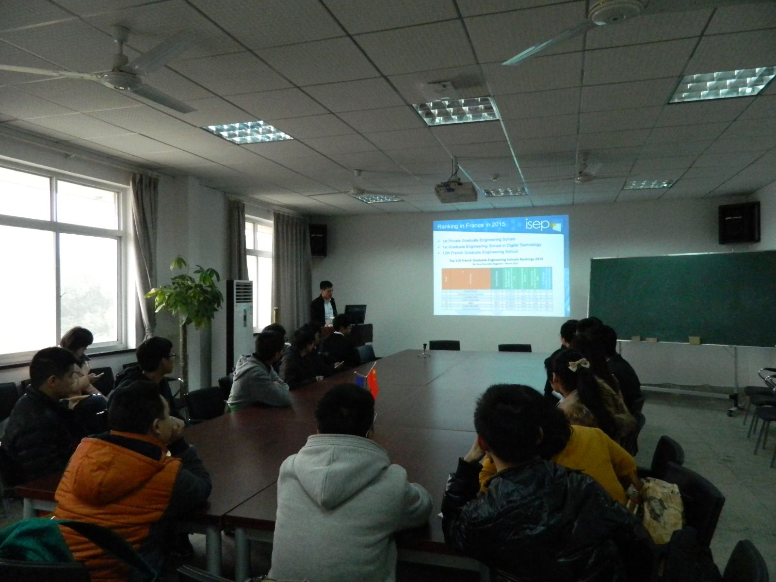 2015年3月11日下午,法国巴黎高电国际关系部主任Thomas Ea教授到访我院,在612学术报告厅举行了宣讲会。中法班2012级、2011级部分同学参加了宣讲会。会上,Ea教授系统地介绍了巴黎高等电子工程师学院的整体概况,并详细解答了现场学生提出的问题。Ea教授与中法班同学就专业申请、法语学习、签证面试等问题进行了互动交流,耐心细致的回答了同学们提出的问题。