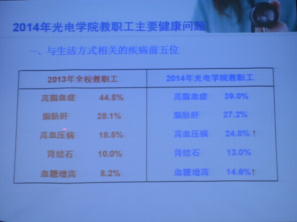 针对近两年来我院教职工的体检结果,孟教授进行了深入全面的分析,并详细介绍了相关常见病的预防和保健知识。此外,他还介绍了校医院在全校师生的健康保健方面所做的工作,倡议师生们要积累保健知识、养成良好的生活习惯。
