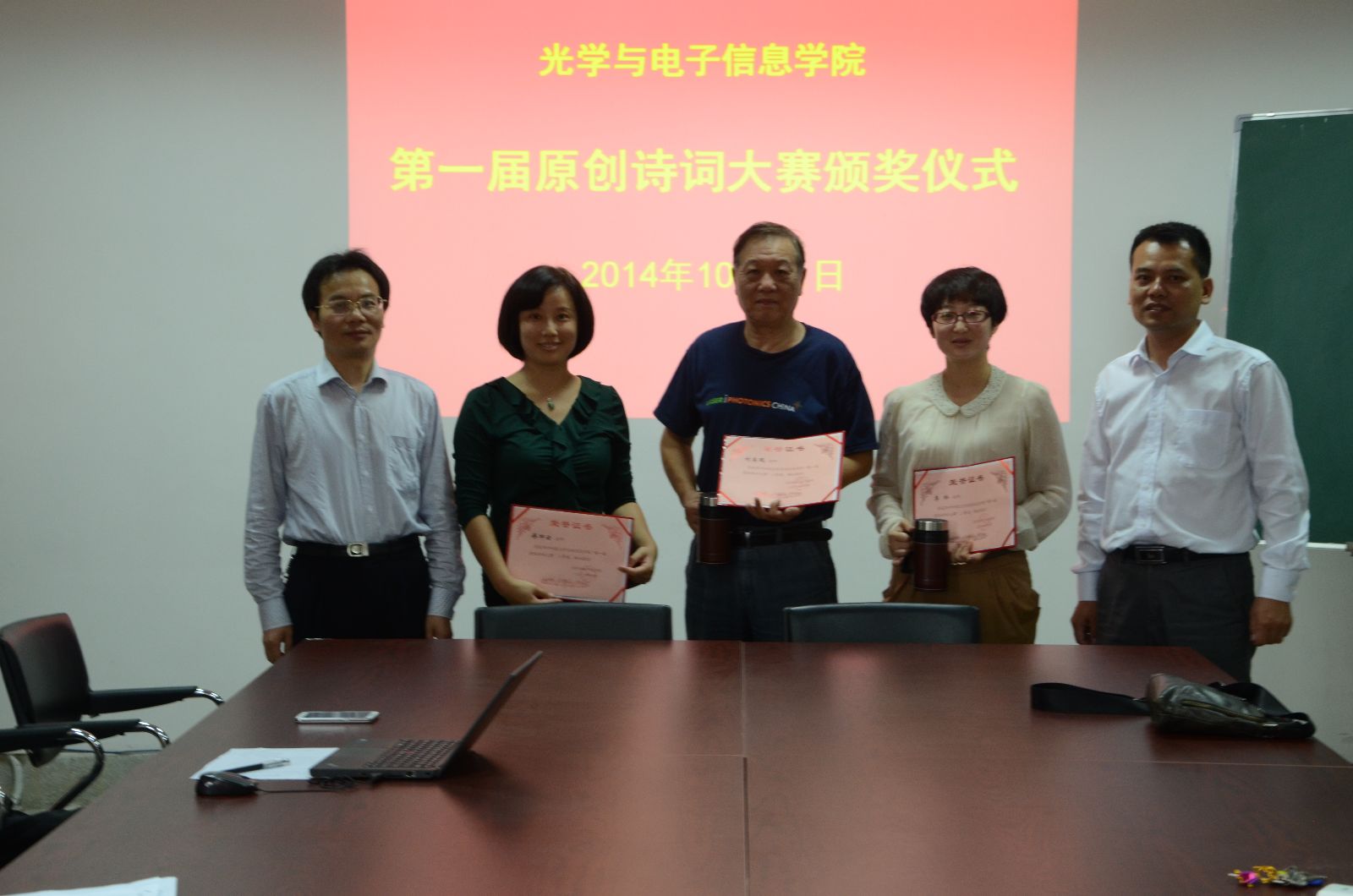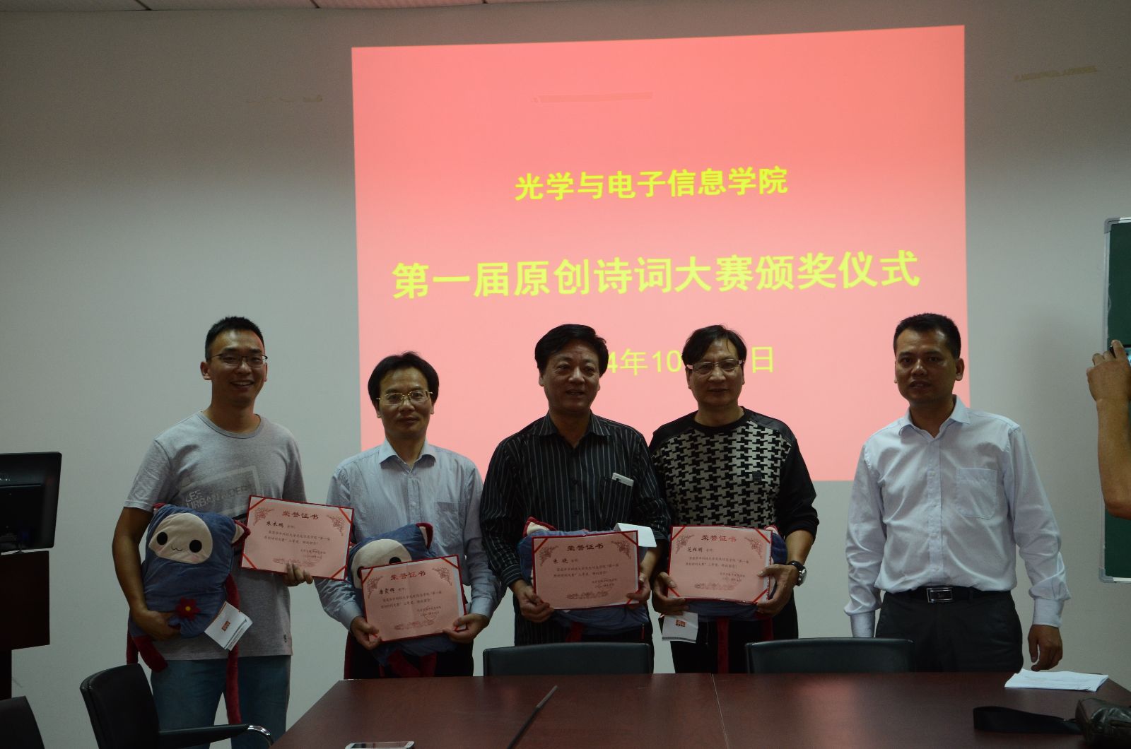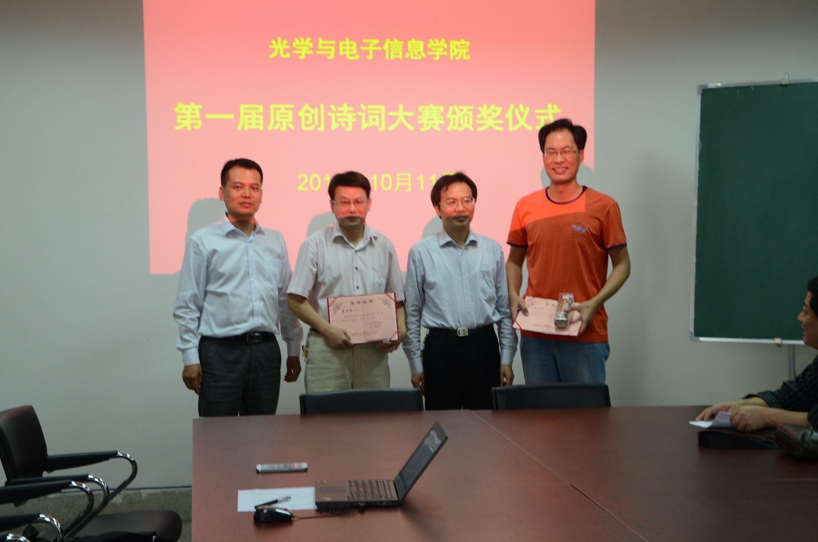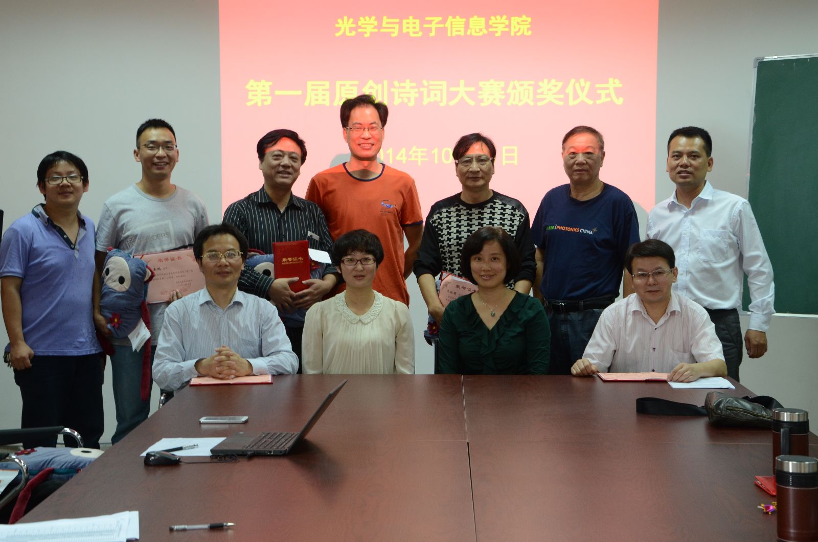 2014年10月11日,光电信息学院教职工原创诗词大赛的颁奖仪式在南五楼612会议室举行。学院党委书记刘继文出席了会议,会议由学院工会主席唐霞辉主持。