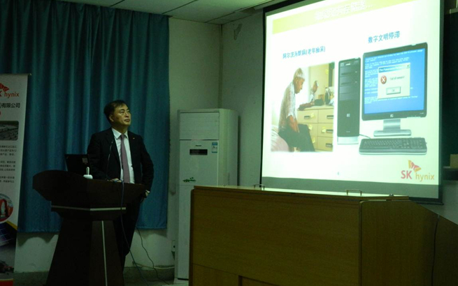 刘继文代表学院欢迎SK海力士副总一行莅临学院,感谢海力士对于我们学院人才培养的支持,并希望双方开展更广泛、更深入的合作。金旭光副总做了一场“存储器的过去与未来”主题报告,并介绍了企业的发展历史、现状、员工的福利待遇和奖学金等情况。
