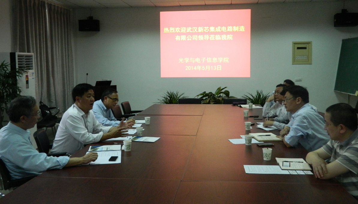5月13日下午,武汉新芯集成电路有限公司高级副总裁李平、CTO梅绍宁等一行到访光电信息学院,与学院洽谈产学研合作。学院院长张新亮,党委书记刘继文、副院长江建军,院长助理雷鑑铭,学院邹雪城教授、缪向水教授、胡作启教授以及邹志革副教授、程晓敏副教授等参加了洽谈活动。