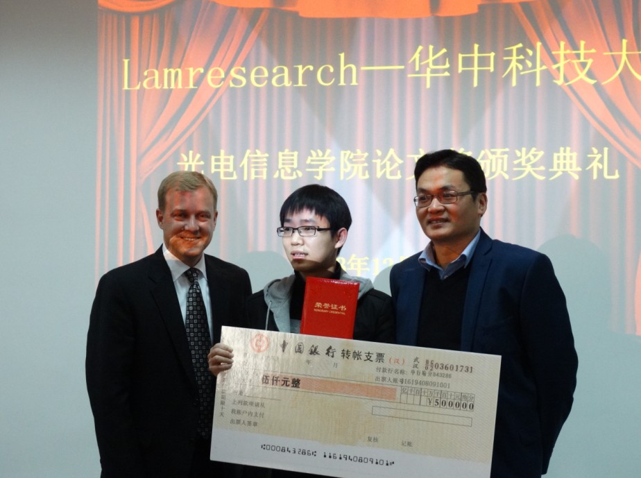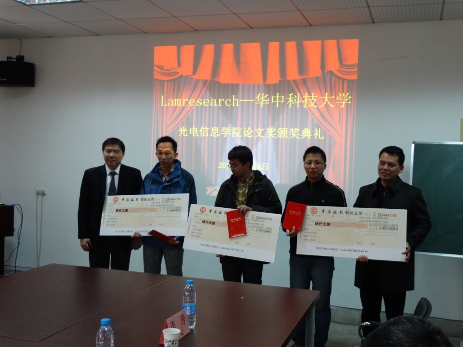Lam Research 公司是一家美国独资企业,总部位于美国加州弗里蒙特市,在行业中处于领先地位。该公司为鼓励光电信息学院的研究生从事半导体及相关设备技术的研发,奖励获发表高水平文章的研究生及其导师,特在我院设立Lam Research论文奖。此次评奖共有9篇论文获奖,喻研获得了一等奖,高南京、陈建雄、向磊获得了二等奖、陈归、邓宇帆、丁进军、李洋、李梦旭获得了三等奖。本次论文评选,集中展示了我院研究生学习阶段取得的丰硕成果,充分展现了我院研究生在各自领域中做出的积极探索。