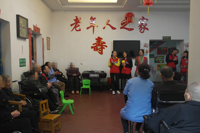 活动开始之前,夏社工给我们义工队进行了简短的培训。活动一共分为四个环节,第一个环节为“破冰”,即为了拉近与老人的距离,缓解初次见面的尴尬,11名义工首先跟老人聊天谈心,老人们很热情,所以接下来的活动开展地非常顺利。第二个环节为表演,为了出色完成此次活动,志愿者事先准备好了一些节目,比如唱歌,打拳等,志愿者的表演得到了老人们热烈的掌声,深受老人喜欢。老人公寓的刘院长为人热情大方,在志愿者表演节目的时候,还向志愿者发起挑战,唱了几首她们拿手的歌曲和戏曲,并为我们的志愿者伴舞,整个过程掌声连连,笑声不断。第三个环节是游戏环节,志愿者配合老人完成了“击鼓传花”的游戏,游戏过程中,老人的参与度也特别高,参与游戏的老人都会得到由社工赠送的小礼品。 第四个环节为与老人道别,虽然只是一个多小时的相处,志愿者与老人还是不舍得分别。
