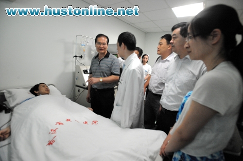 手术当天,校党委副书记欧阳康,学工处处长易元祥、校团委书记王小月等来到武汉市中心医院,向医生了解手术实施情况。在病房里,欧阳康向冯盘龙表示亲切慰问,希望他好好休息,尽快康复,也祝愿他在全国大学生电子设计竞赛中取得好成绩。欧阳康还要求学校相关单位负责人认真做好后续工作,让冯盘龙同学早日恢复健康,学业不受影响。