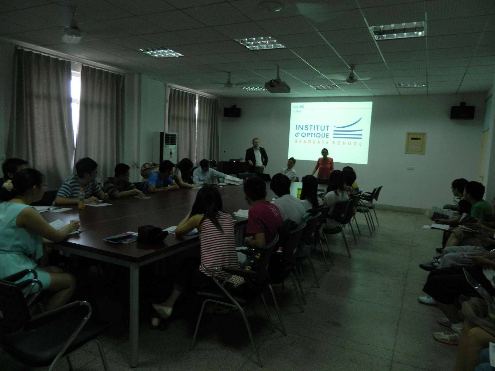 6月13日下午,巴黎高科50名工程师项目负责人Gaetan Messin教授及该校在华合作伙伴上海唐沪人才咨询有限公司总裁唐顺先生到访我院,并与中法班学生交流。学院党委书记刘继文与副院长杨克成教授会见了来宾,中法班相关负责老师以及2011、2012级全体中法班学生和部分10级中法班学生代表参加了交流会座谈。刘继文书记首先向客人详细介绍了光电国家教育试点学院的运行状况,杨克成副院长向客人具体介绍了光电中法班的办班情况。随后,Gaetan Messin教授为中法班同学详细介绍了巴黎高科的基本概况及其在华招生具体事宜,内容涉及到在巴黎高科攻读硕士、博士学位、工程师学位的外国留学生学习、生活、就业等各方面的问题。最后,Gaetan Messin教授与中法班同学就专业申请、法语学习、签证面试等问题进行了互动交流,耐心细致地回答了同学们提出的问题。