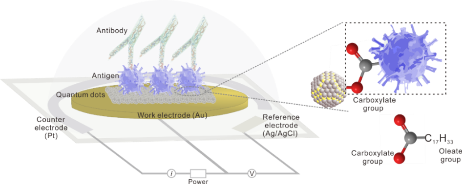 图1:新冠病毒蛋白检测用量子点传感器及其电学标记方法示意图