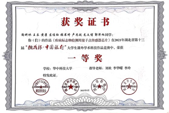 在国家自然科学基金优秀青年科学基金、华中科技大学“学术前沿青年团队支持计划”、武汉光电国家研究中心创新研究项目的资助支持下,刘欢教授课题组进一步发展了量子点生物分子电学标记技术。与华中科技大学同济医学院附属协和医院有关科室紧密合作,设计制备了针对鼻炎、膀胱癌等疾病标志物快速检测的量子点半导体传感器,相关工作论文先后发表于Chinese Journal of Analytical Chemistry(详见https://doi.org/10.1016/j.cjac.2021.11.007)、功能材料与器件学报(详见https://gncq.cbpt.cnki.net/WKD2/WebPublication/index.aspx?mid=gncq)。